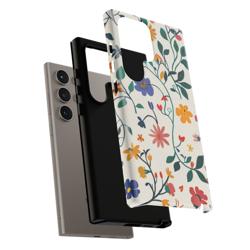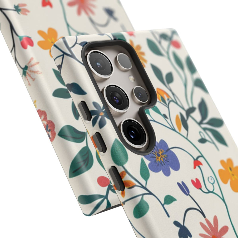 Dit ontwerp heeft een levendig bloemenpatroon met diverse kleurrijke bloemen en groene klimop die sierlijk door elkaar heen lopen. De bloemen zijn uitgevoerd in tinten paars, geel, roze, rood en oranje, op een lichtbeige achtergrond. De groene bladeren en stelen geven een natuurlijke uitstraling en zorgen voor een verfijnd en vrolijk botanisch geheel. Het patroon is bedrukt op een mat hoesje met een stevige polycarbonaat buitenkant en een TPU binnenzijde, waardoor het hoesje optimale bescherming biedt en geschikt is voor draadloos opladen.