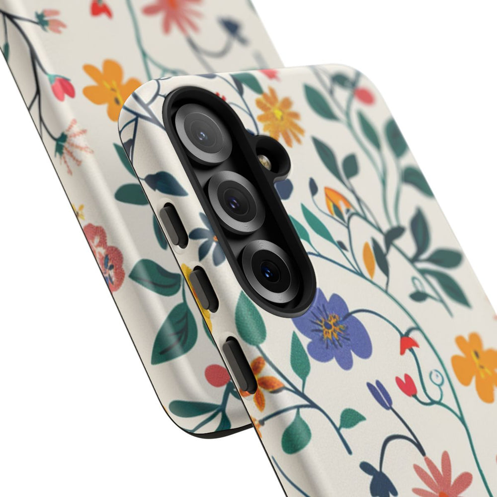 Dit ontwerp heeft een levendig bloemenpatroon met diverse kleurrijke bloemen en groene klimop die sierlijk door elkaar heen lopen. De bloemen zijn uitgevoerd in tinten paars, geel, roze, rood en oranje, op een lichtbeige achtergrond. De groene bladeren en stelen geven een natuurlijke uitstraling en zorgen voor een verfijnd en vrolijk botanisch geheel. Het patroon is bedrukt op een mat hoesje met een stevige polycarbonaat buitenkant en een TPU binnenzijde, waardoor het hoesje optimale bescherming biedt en geschikt is voor draadloos opladen.