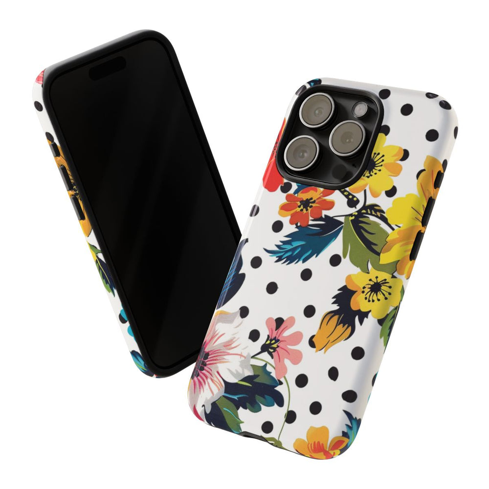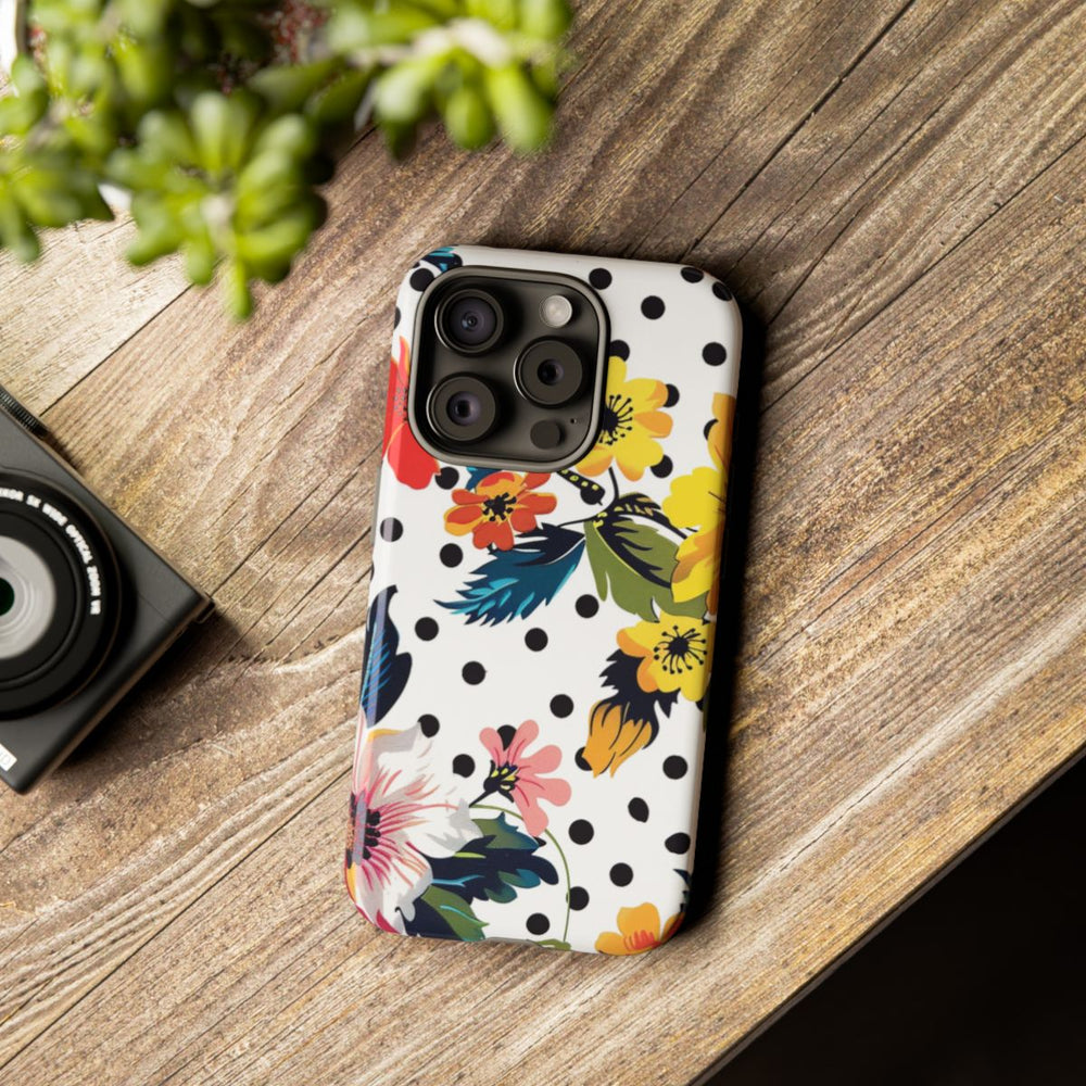 Dit telefoonhoesje heeft een opvallend bloemenpatroon met grote, kleurrijke bloemen in tinten geel, rood, roze, blauw en wit. De bloemen worden omringd door groene en blauwe bladeren en zijn geplaatst op een witte achtergrond met gelijkmatig verdeelde zwarte stippen. Het levendige ontwerp combineert speelse bloemen met een klassiek polkadotmotief voor een frisse en vrolijke uitstraling. Het glanzende, stevige hoesje bestaat uit twee lagen voor extra bescherming en duurzaamheid, en ondersteunt draadloos opladen.
