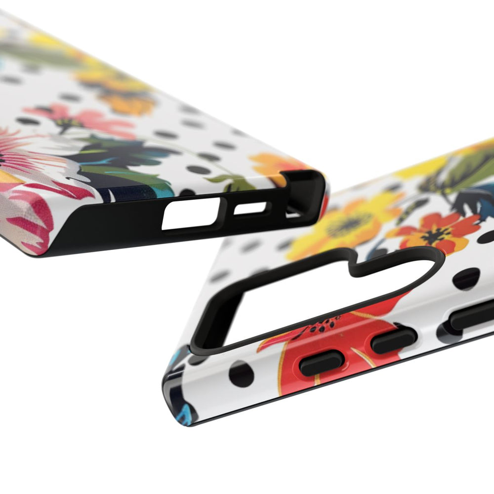 Dit telefoonhoesje heeft een opvallend bloemenpatroon met grote, kleurrijke bloemen in tinten geel, rood, roze, blauw en wit. De bloemen worden omringd door groene en blauwe bladeren en zijn geplaatst op een witte achtergrond met gelijkmatig verdeelde zwarte stippen. Het levendige ontwerp combineert speelse bloemen met een klassiek polkadotmotief voor een frisse en vrolijke uitstraling. Het glanzende, stevige hoesje bestaat uit twee lagen voor extra bescherming en duurzaamheid, en ondersteunt draadloos opladen.