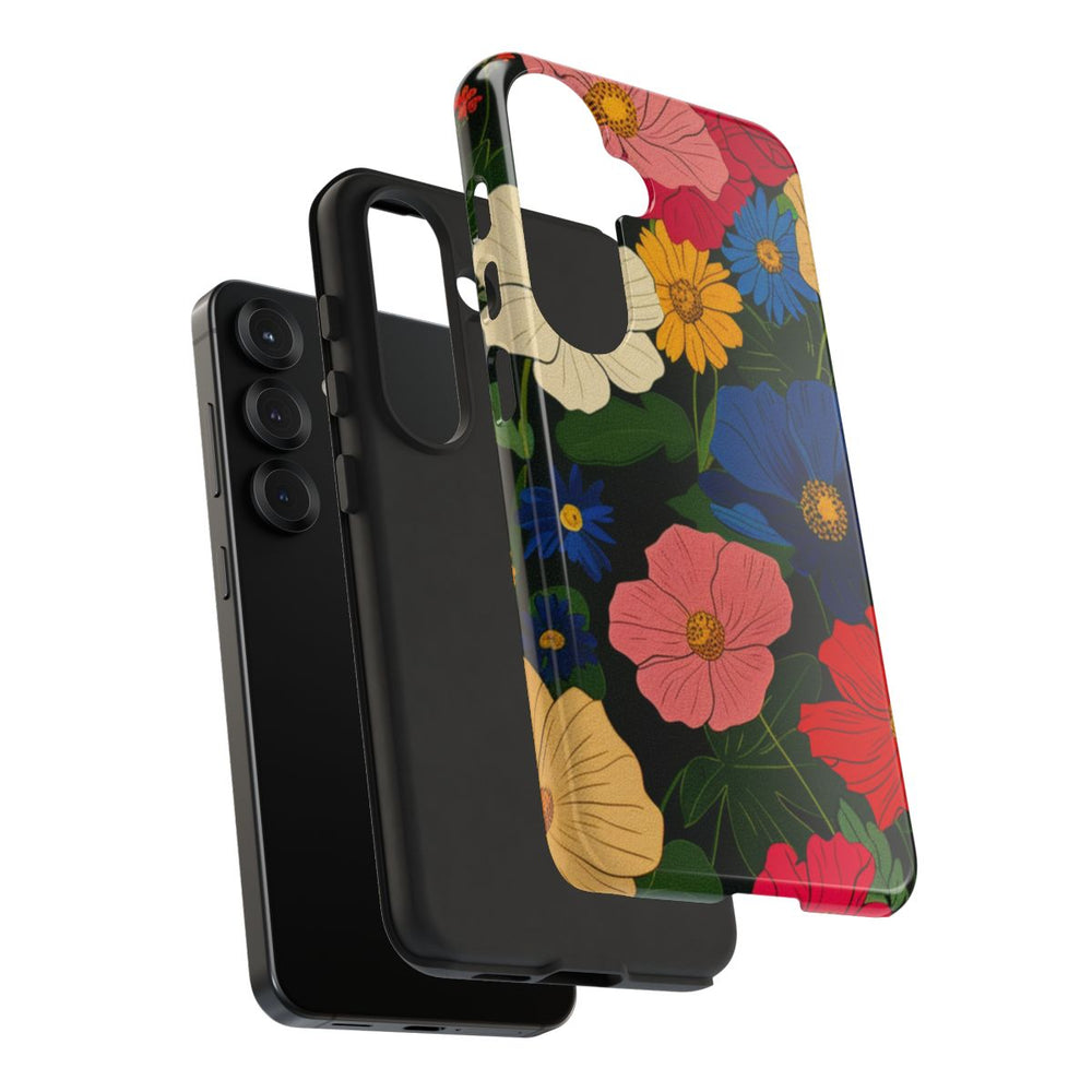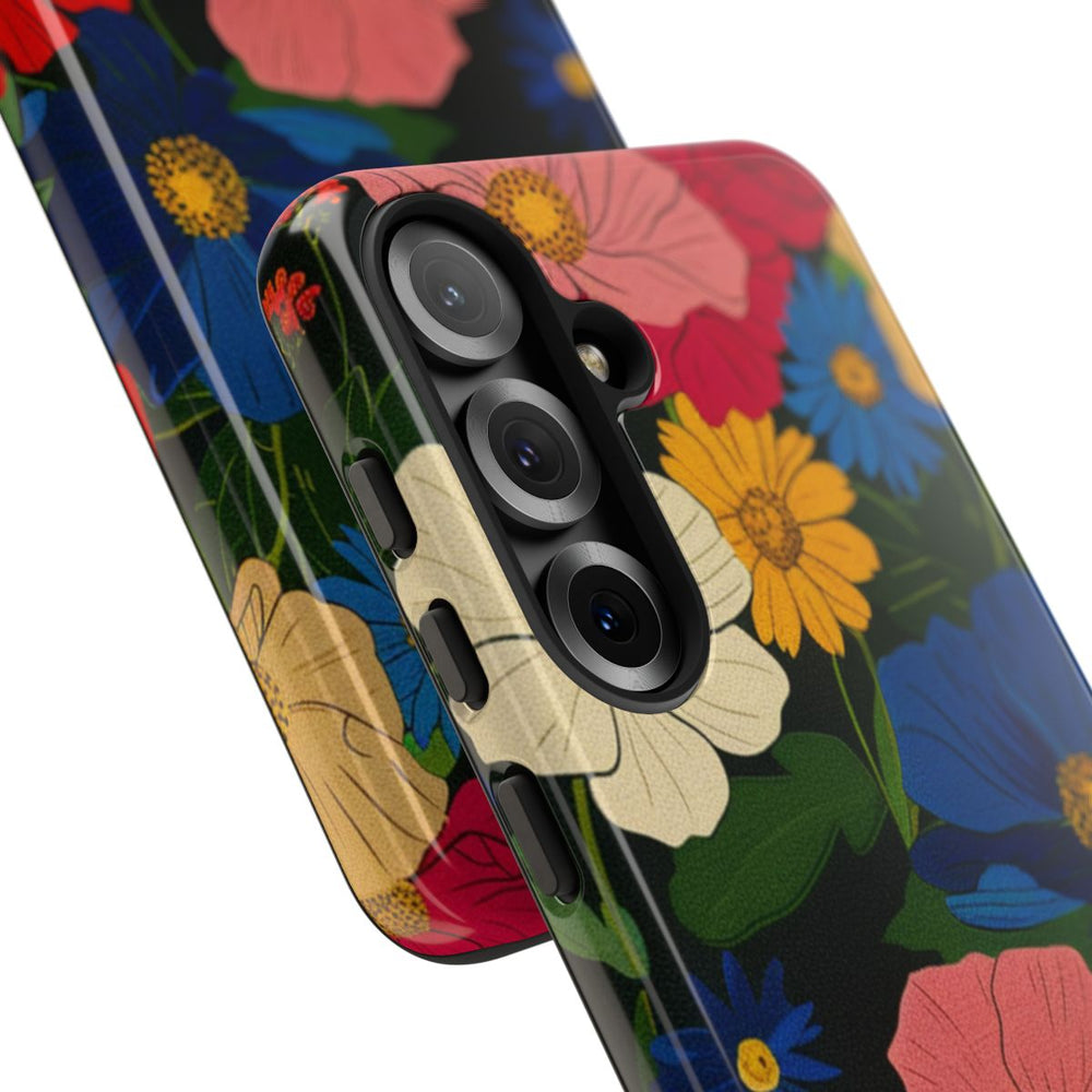 Dit hoesje heeft een levendig bloemenpatroon met verschillende soorten bloemen in rood, roze, blauw, geel en wit. De bloemen zijn gedetailleerd met gele hartjes en staan op een donkere achtergrond met groene bladeren en stelen. Het patroon is dicht en speels, wat zorgt voor een rijke en kleurrijke uitstraling. Het hoesje heeft een glanzende afwerking, bestaat uit een polycarbonaat buitenkant en een TPU binnenzijde, en is ontworpen voor stevigheid en bescherming buitenshuis. Ondersteunt draadloos opladen.