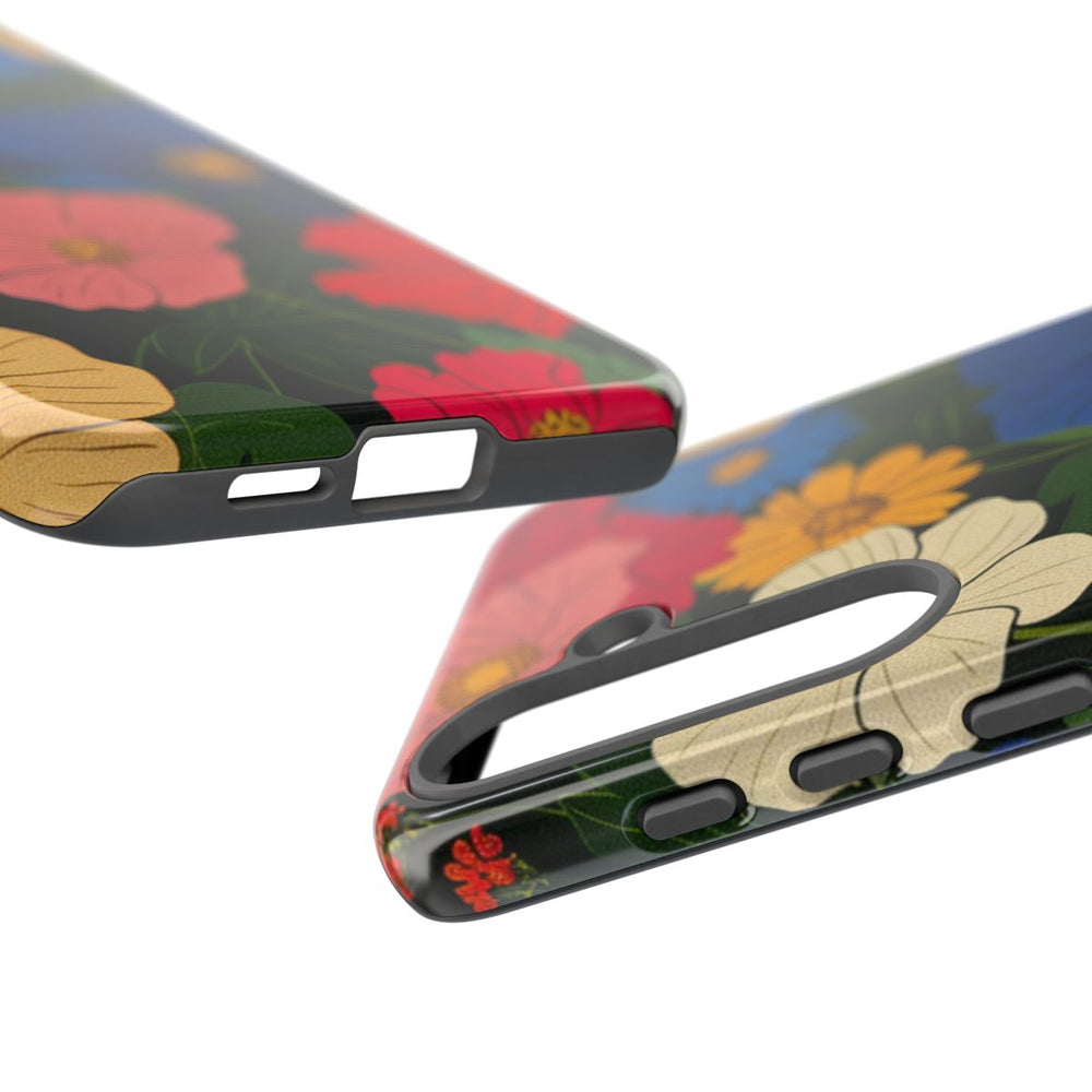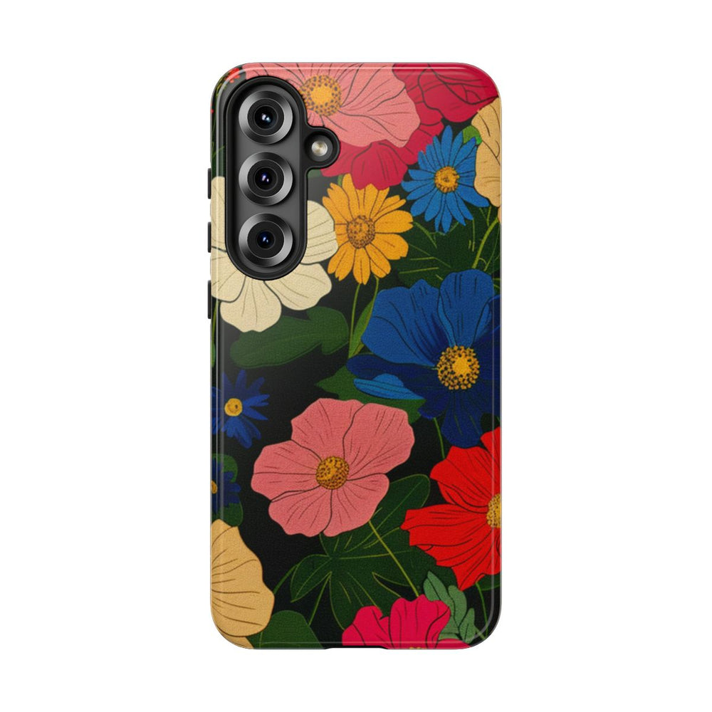 Dit hoesje heeft een levendig bloemenpatroon met verschillende soorten bloemen in rood, roze, blauw, geel en wit. De bloemen zijn gedetailleerd met gele hartjes en staan op een donkere achtergrond met groene bladeren en stelen. Het patroon is dicht en speels, wat zorgt voor een rijke en kleurrijke uitstraling. Het hoesje heeft een glanzende afwerking, bestaat uit een polycarbonaat buitenkant en een TPU binnenzijde, en is ontworpen voor stevigheid en bescherming buitenshuis. Ondersteunt draadloos opladen.