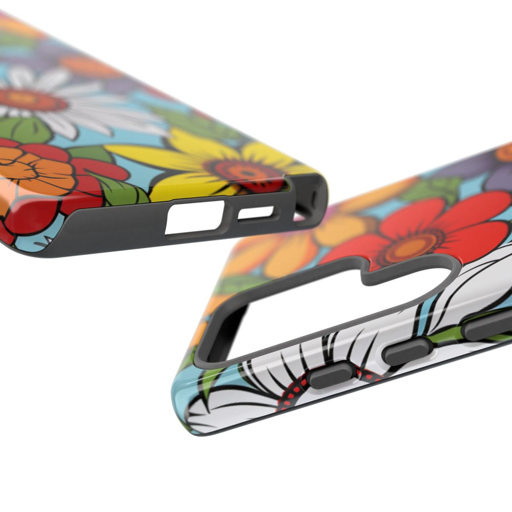 Dit hoesje heeft een opvallend bloemenpatroon met diverse bloemen in heldere kleuren zoals rood, oranje, geel, wit, paars en blauw. De bloemen zijn voorzien van stevige zwarte contouren en worden omringd door groene bladeren. De lichtblauwe achtergrond versterkt de levendige en vrolijke uitstraling. Het patroon is gedrukt op een glanzend, stevig hoesje van polycarbonaat en TPU, dat zorgt voor duurzaamheid en bescherming. Ondersteunt draadloos opladen.