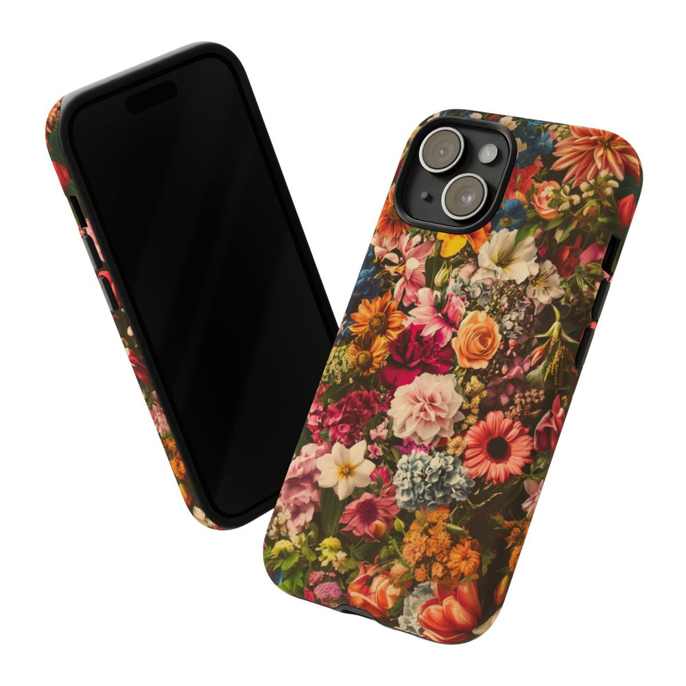 Dit ontwerp heeft een dicht en levendig patroon van verschillende bloemen in uiteenlopende kleuren, zoals geel, roze, oranje, blauw, wit en rood. De bloemen zijn dicht op elkaar geplaatst, wat zorgt voor een rijk en vrolijk geheel. Het hoesje bestaat uit twee lagen: een stevige polycarbonaat buitenkant en een TPU-binnenkant, waardoor het duurzaam is en geschikt voor draadloos opladen. De uitstraling is helder en kleurrijk, ideaal voor liefhebbers van bloemenmotieven.