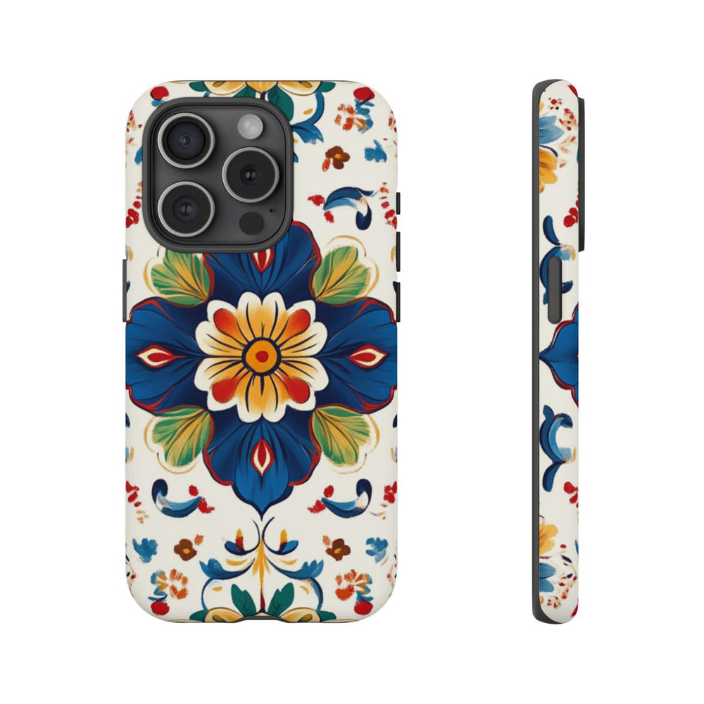 Dit telefoonhoesje heeft een levendig bloemenpatroon met grote, gestileerde bloemen in blauw-, geel- en groentinten. De bloemen zijn symmetrisch gerangschikt op een witte achtergrond, met kleinere rode en oranje accenten die het geheel opfleuren. Het patroon oogt handgeschilderd dankzij de zichtbare penseelstreken en het evenwichtige, herhalende ontwerp. Het hoesje bestaat uit twee lagen van polycarbonaat en TPU voor extra stevigheid en bescherming, en ondersteunt draadloos opladen.