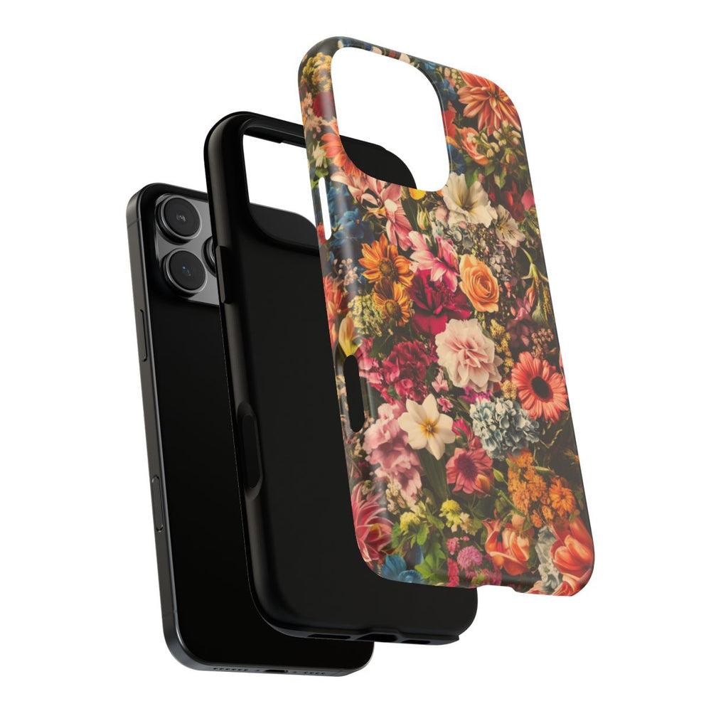 Dit hoesje heeft een dicht en levendig patroon van bloemen in verschillende kleuren, waaronder geel, roze, oranje, blauw, wit en rood. De bloemen zijn dicht op elkaar geplaatst, wat zorgt voor een rijk en vrolijk geheel. Het hoesje bestaat uit twee lagen: een stevige polycarbonaat buitenkant en een TPU binnenzijde voor extra bescherming en duurzaamheid. Ondersteunt draadloos opladen, maar niet MagSafe.