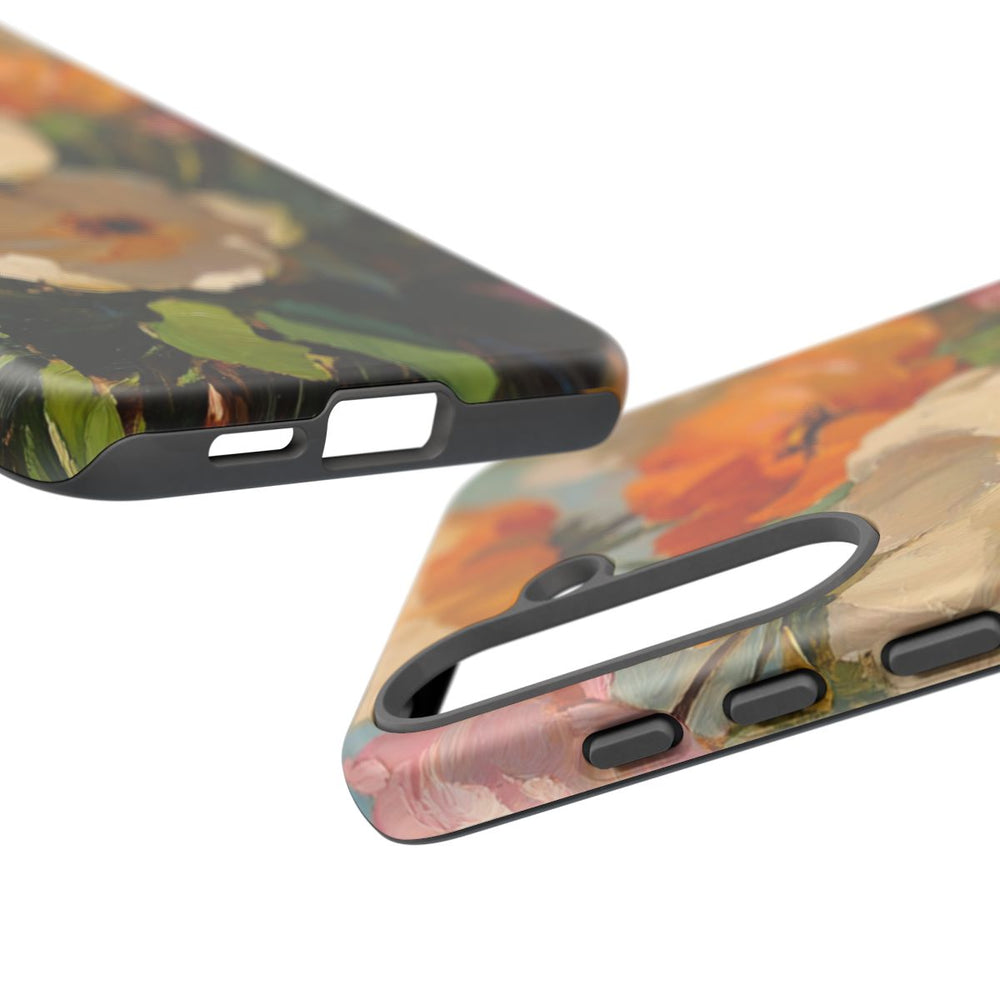Dit hoesje is versierd met een levendig olieverfschilderij van bloemen in volle bloei. De bloemen zijn uitgevoerd in tinten roze, geel, oranje, wit en blauw, omringd door groene bladeren. De expressieve penseelstreken geven het ontwerp een dynamisch en levendig karakter. Het hoesje bestaat uit twee lagen: een stevige polycarbonaat buitenkant en een TPU-binnenzijde, wat zorgt voor extra duurzaamheid en bescherming tegen verschillende weersomstandigheden. Ondersteunt draadloos opladen. Niet geschikt voor MagSafe.