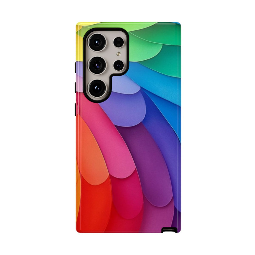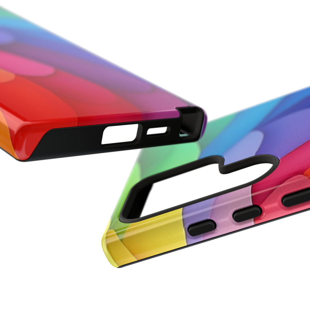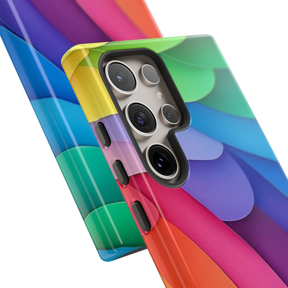 Dit ontwerp heeft een levendig, gelaagd patroon dat lijkt op overlappende gebogen vormen in de zeven kleuren van de regenboog. De kleuren lopen vloeiend over van warme tinten rood, oranje en geel aan de ene kant naar koelere tinten groen, blauw en paars aan de andere kant. Het geheel zorgt voor een dynamisch en aantrekkelijk abstract effect. Dit glanzende, stevige hoesje bestaat uit een dubbele laag met een polycarbonaat buitenkant en een TPU-binnenzijde. Zo biedt het extra stevigheid en bescherming, en is het geschikt voor draadloos opladen.