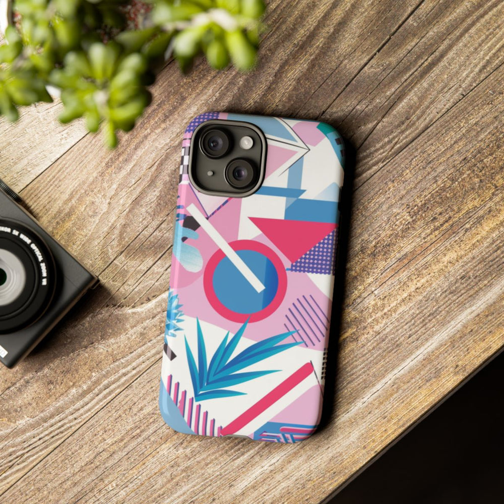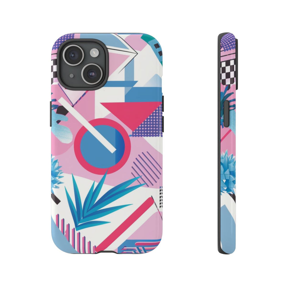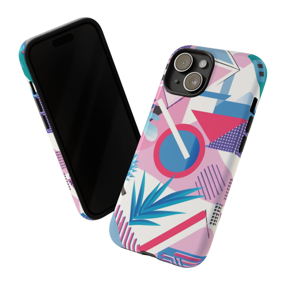 Dit telefoonhoesje heeft een abstract geometrisch patroon met een levendige mix van vormen zoals driehoeken, cirkels, rechthoeken en lijnen. De kleuren zijn voornamelijk blauw, roze en teal, met accenten in zwart en wit. In het ontwerp zijn ook gestileerde bladeren en getextureerde vormen verwerkt, wat zorgt voor een dynamische en moderne uitstraling. Het hoesje is glanzend en stevig, gemaakt van polycarbonaat en TPU, en biedt uitstekende bescherming en ondersteuning voor draadloos opladen.