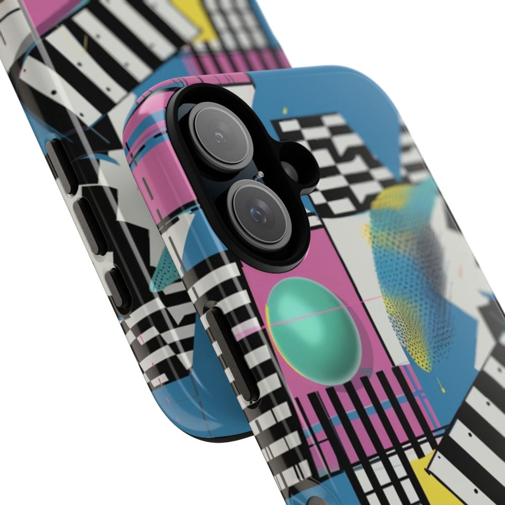 Dit hoesje heeft een opvallend abstract patroon met een mix van geometrische vormen zoals vierkanten, rechthoeken en cirkels. Het ontwerp combineert verschillende kleuren, waaronder blauw, roze, geel, zwart en wit. Diverse texturen en patronen zoals strepen, ruitjes, stippen en rastermotieven zorgen voor een speels en levendig uiterlijk. Het hoesje heeft een glanzende afwerking en bestaat uit twee lagen: een stevige polycarbonaat buitenkant en een TPU binnenzijde voor extra bescherming en duurzaamheid. Geschikt voor draadloos opladen, maar niet compatibel met MagSafe.