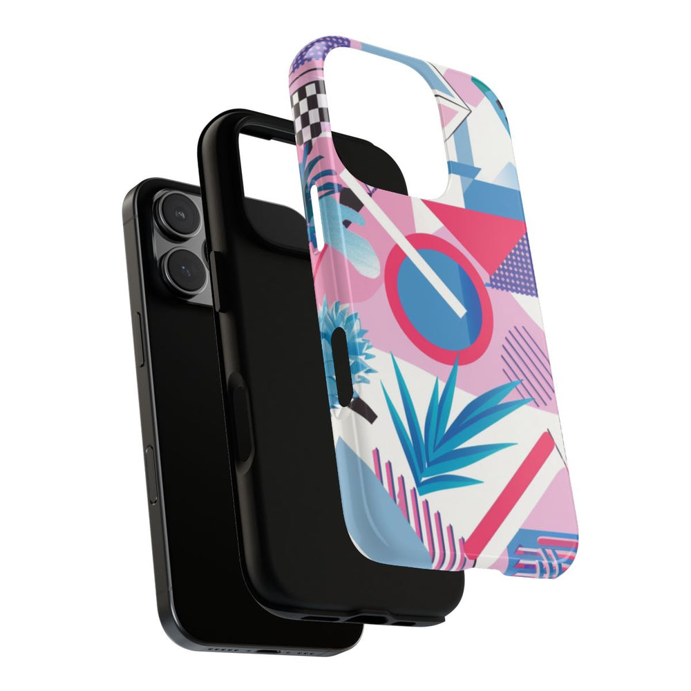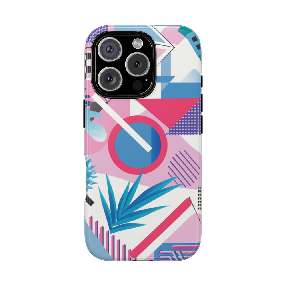 Dit telefoonhoesje heeft een abstract geometrisch patroon met een levendige mix van vormen zoals driehoeken, cirkels, rechthoeken en lijnen. De kleuren zijn voornamelijk blauw, roze en teal, met accenten in zwart en wit. In het ontwerp zijn ook gestileerde bladeren en getextureerde vormen verwerkt, wat zorgt voor een dynamische en moderne uitstraling. Het hoesje is glanzend en stevig, gemaakt van polycarbonaat en TPU, en biedt uitstekende bescherming en ondersteuning voor draadloos opladen.