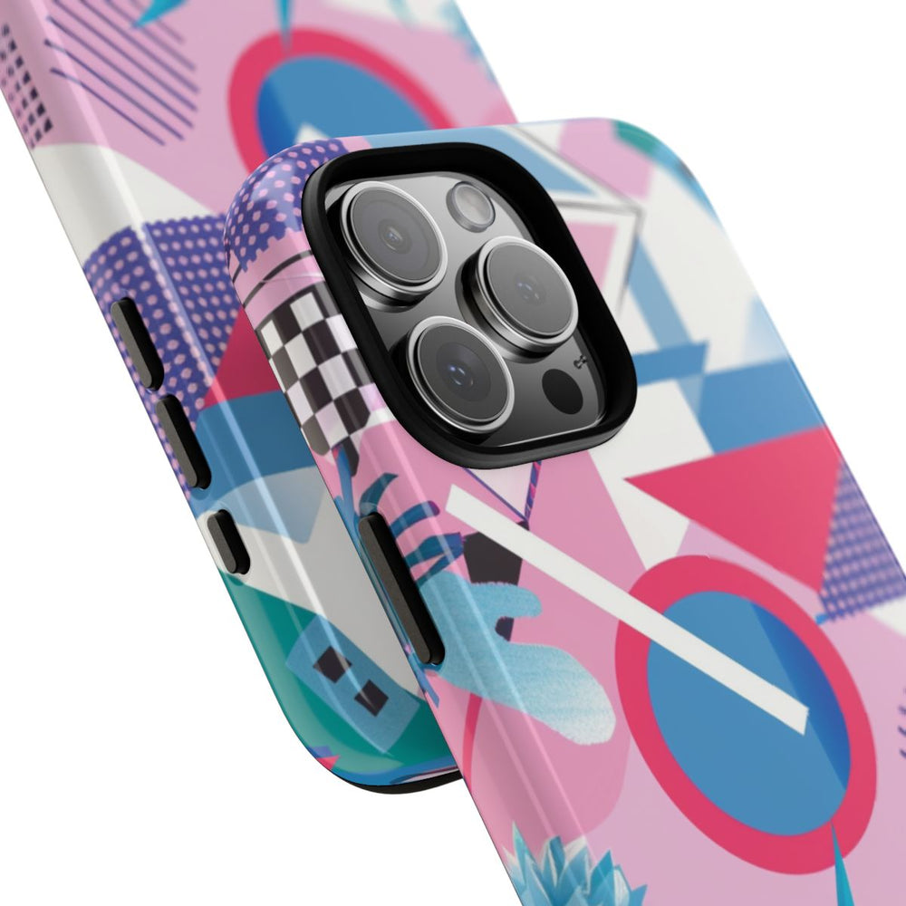 Dit telefoonhoesje heeft een abstract geometrisch patroon met een levendige mix van vormen zoals driehoeken, cirkels, rechthoeken en lijnen. De kleuren zijn voornamelijk blauw, roze en teal, met accenten in zwart en wit. In het ontwerp zijn ook gestileerde bladeren en getextureerde vormen verwerkt, wat zorgt voor een dynamische en moderne uitstraling. Het hoesje is glanzend en stevig, gemaakt van polycarbonaat en TPU, en biedt uitstekende bescherming en ondersteuning voor draadloos opladen.