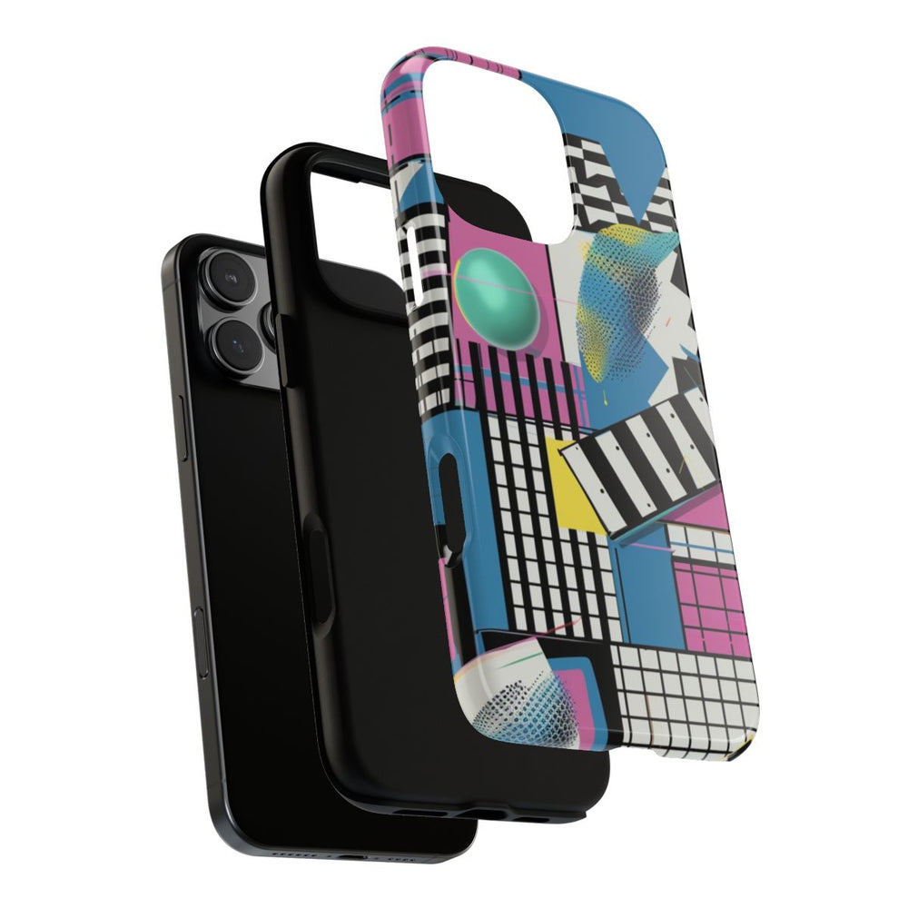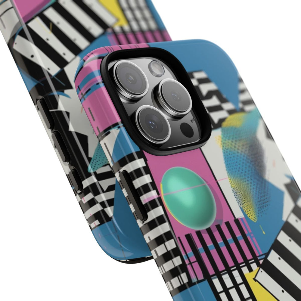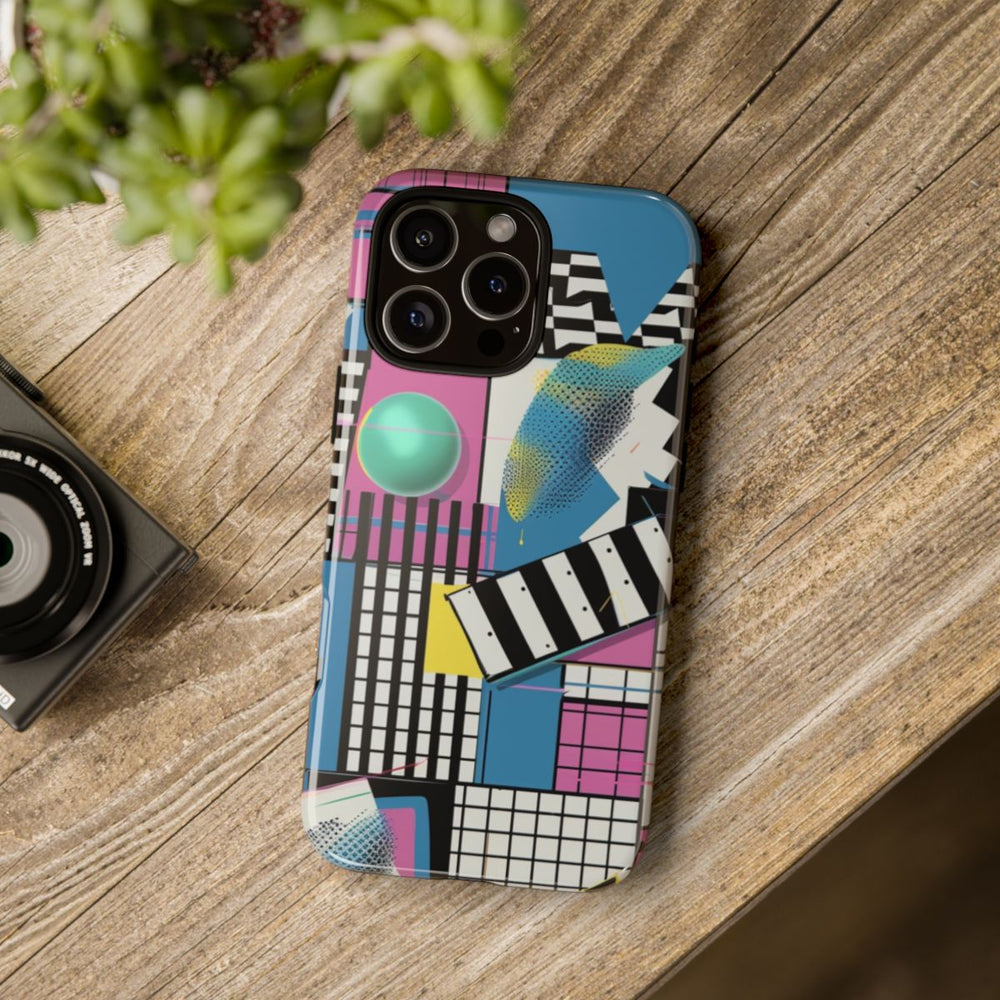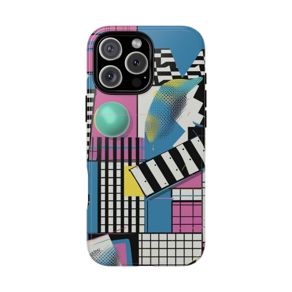 Dit telefoonhoesje heeft een opvallend abstract ontwerp met een mix van geometrische vormen zoals vierkanten, rechthoeken en cirkels. Het patroon bestaat uit verschillende kleuren, waaronder blauw, roze, geel, zwart en wit. Diverse texturen en patronen zoals strepen, ruitjes, stippen en rasterpunten zorgen voor een speels en uniek uiterlijk. Het hoesje heeft een glanzende afwerking en is extra stevig dankzij de dubbele laag: een buitenkant van polycarbonaat en een binnenkant van TPU. Dit zorgt voor optimale bescherming tegen stoten en krassen. Draadloos opladen wordt ondersteund, maar het hoesje is niet geschikt voor MagSafe-accessoires.