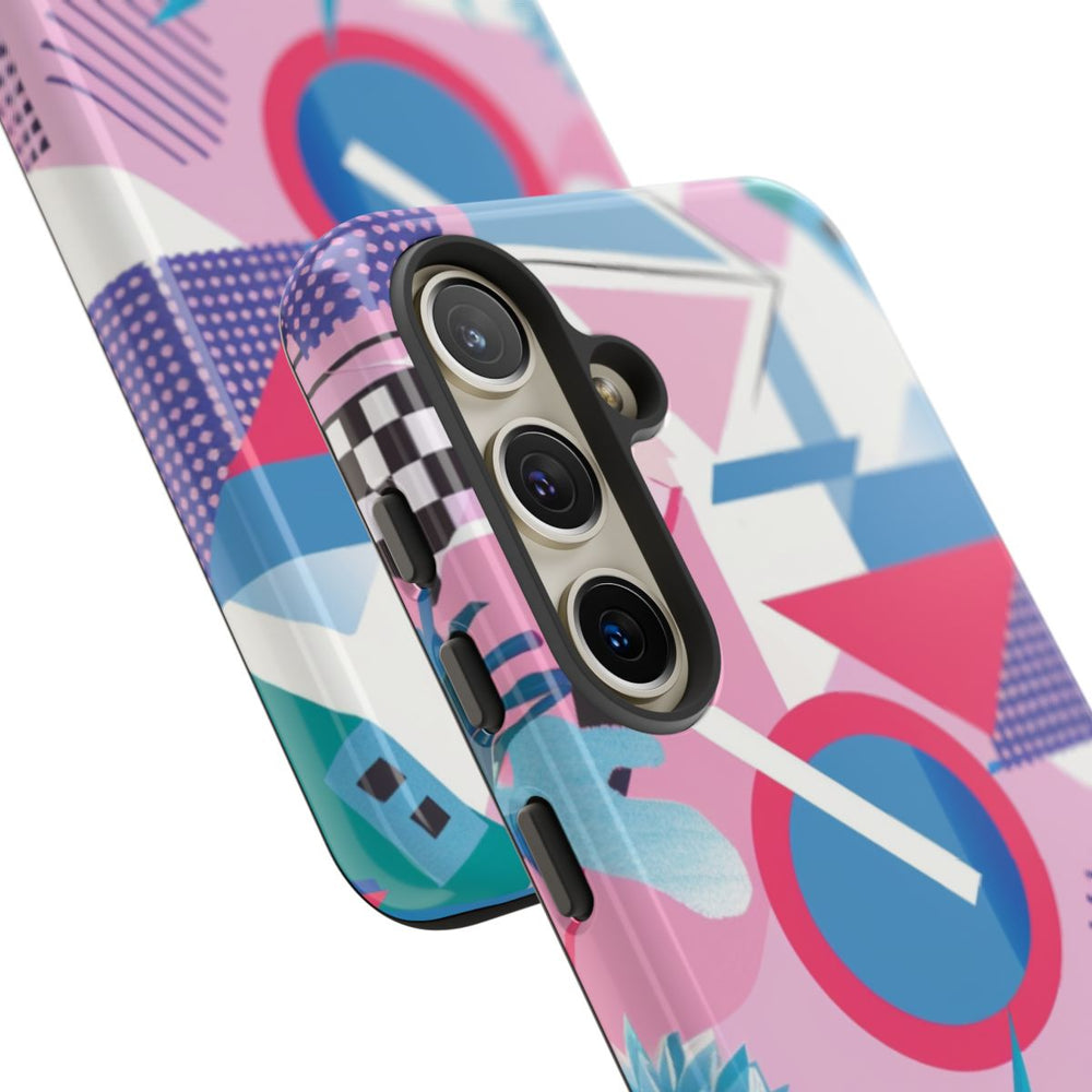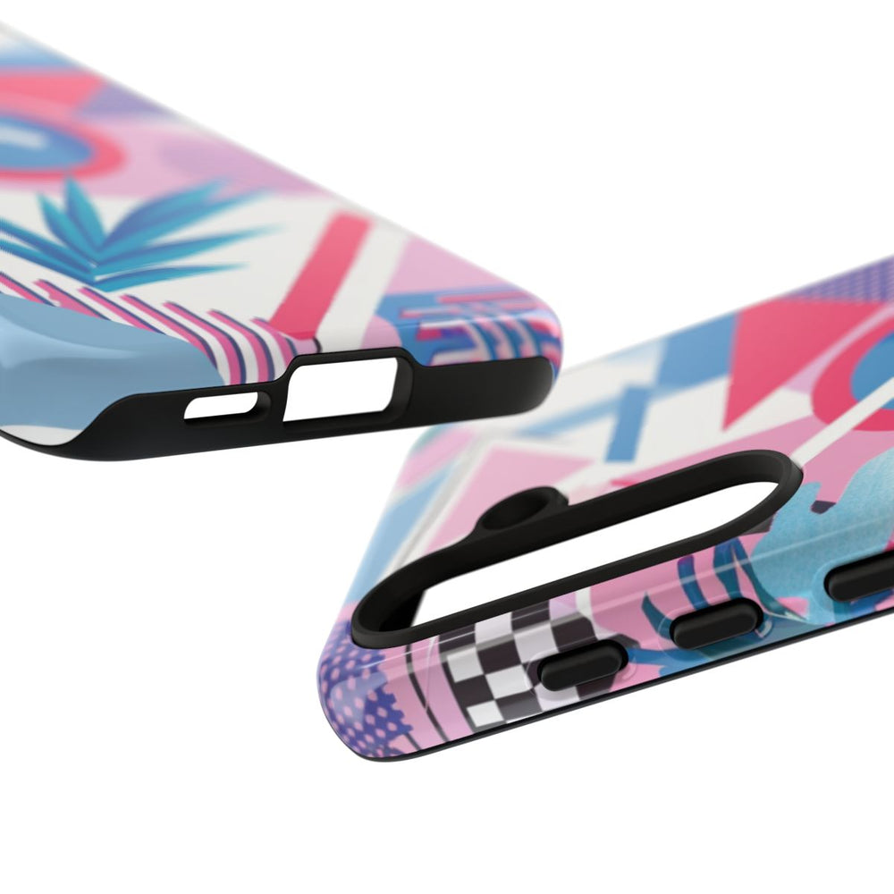 Dit telefoonhoesje heeft een abstract geometrisch patroon met een levendige mix van vormen zoals driehoeken, cirkels, rechthoeken en lijnen. De kleuren zijn voornamelijk blauw, roze en teal, met accenten in zwart en wit. In het ontwerp zijn ook gestileerde bladeren en getextureerde vormen verwerkt, wat zorgt voor een dynamische en moderne uitstraling. Het hoesje is glanzend en stevig, gemaakt van polycarbonaat en TPU, en biedt uitstekende bescherming en ondersteuning voor draadloos opladen.