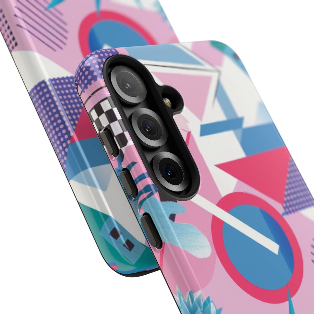 Dit telefoonhoesje heeft een abstract geometrisch patroon met een levendige mix van vormen zoals driehoeken, cirkels, rechthoeken en lijnen. De kleuren zijn voornamelijk blauw, roze en teal, met accenten in zwart en wit. In het ontwerp zijn ook gestileerde bladeren en getextureerde vormen verwerkt, wat zorgt voor een dynamische en moderne uitstraling. Het hoesje is glanzend en stevig, gemaakt van polycarbonaat en TPU, en biedt uitstekende bescherming en ondersteuning voor draadloos opladen.
