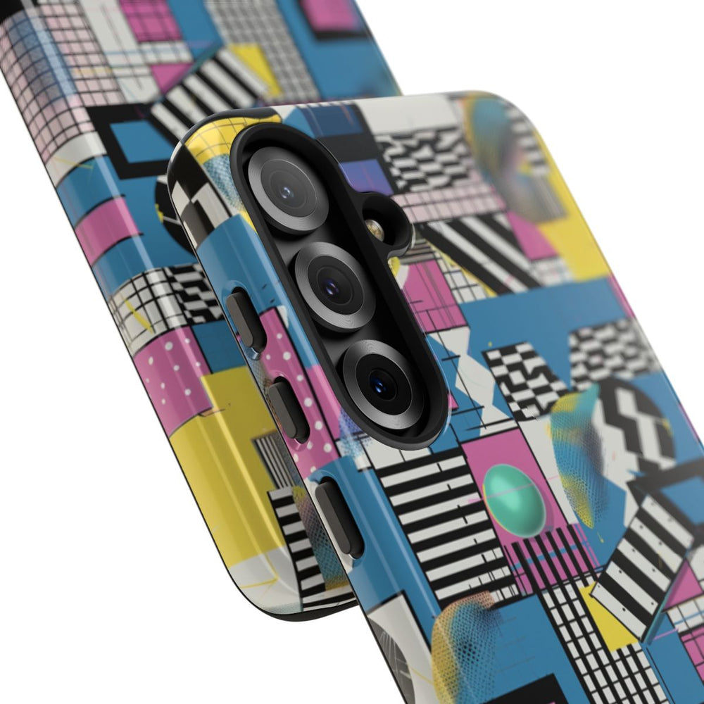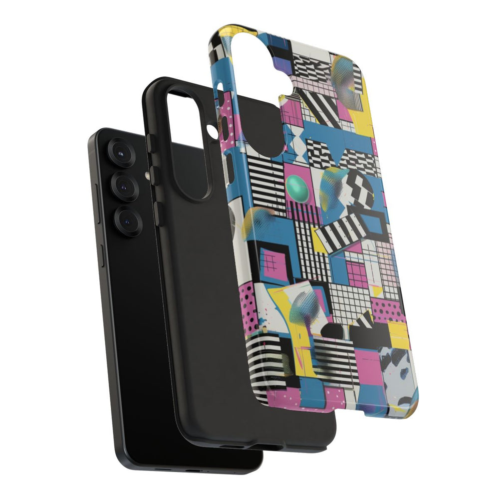 Dit telefoonhoesje heeft een opvallend abstract patroon met een mix van geometrische vormen en levendige kleuren. Het ontwerp bevat rechthoeken, vierkanten en cirkels in tinten blauw, roze, geel, zwart en wit. Verschillende texturen en patronen zoals strepen, stippen en rasters zijn door het hele ontwerp verwerkt, wat zorgt voor een dynamische en speelse uitstraling. Het hoesje is glanzend afgewerkt, bestaat uit twee lagen voor extra bescherming en is geschikt voor draadloos opladen.