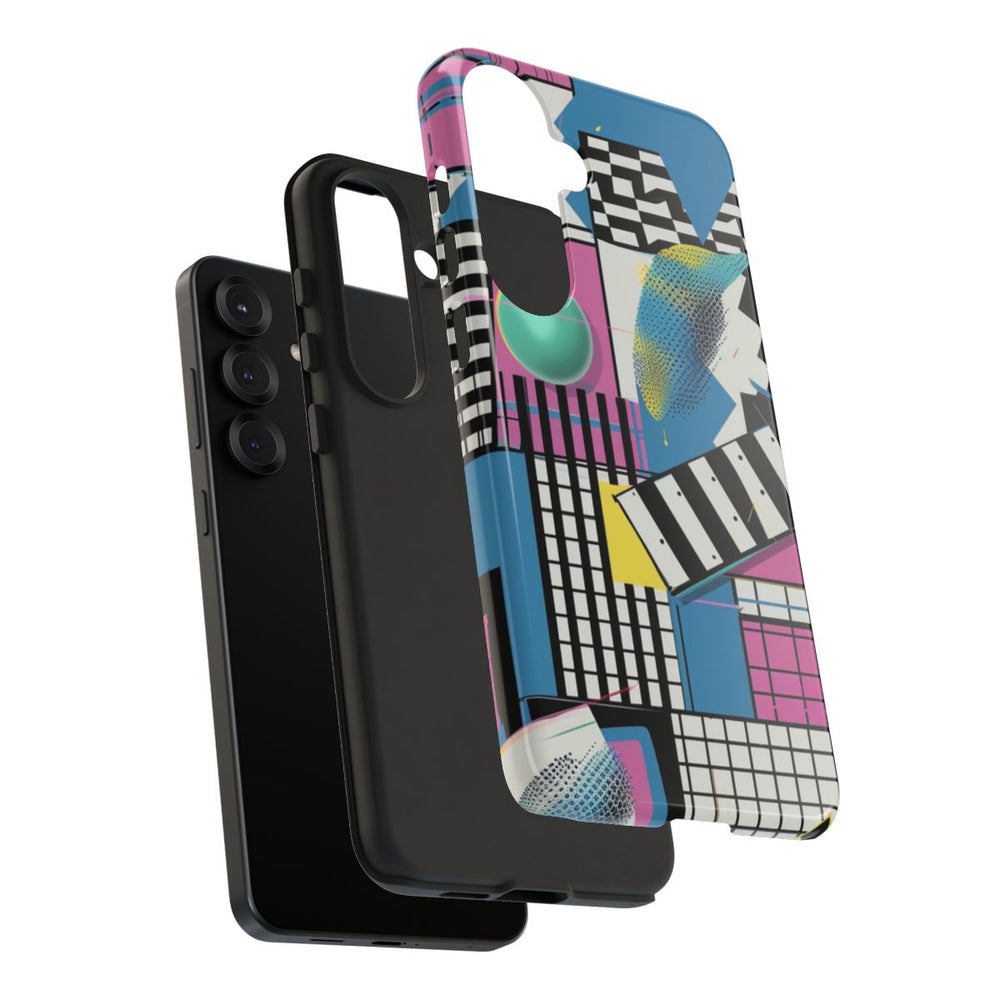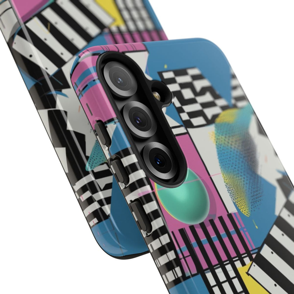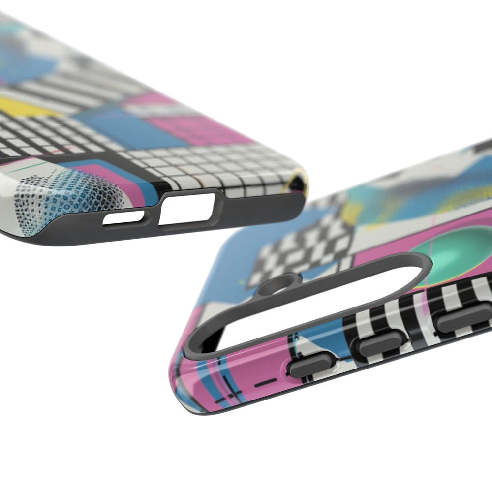 Dit hoesje heeft een opvallend abstract patroon met een mix van geometrische vormen zoals vierkanten, rechthoeken en cirkels. Het ontwerp combineert verschillende kleuren, waaronder blauw, roze, geel, zwart en wit. Diverse texturen en patronen, zoals strepen, rasters, stippen en halftoonpunten, zorgen voor een speels en levendig effect. Het hoesje heeft een glanzende afwerking en bestaat uit twee lagen: een stevige polycarbonaat buitenkant en een TPU-binnenkant voor extra stevigheid en bescherming. Geschikt voor draadloos opladen. Niet geschikt voor MagSafe.