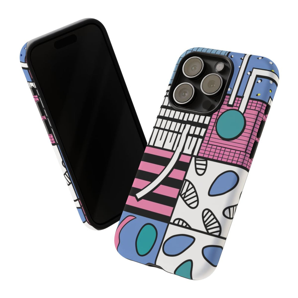 Dit hoesje heeft een kleurrijk abstract patroon met verschillende geometrische vormen en lijnen, gerangschikt in een raster. De vlakken zijn gevuld met diverse motieven zoals stippen, strepen, ruitjes en organische vormen in tinten roze, blauw, wit, zwart en teal. Het hoesje bestaat uit twee lagen met een matte afwerking: een stevige polycarbonaat buitenkant en een TPU binnenzijde voor extra stevigheid en bescherming. Ondersteunt draadloos opladen en is bestand tegen weersinvloeden.