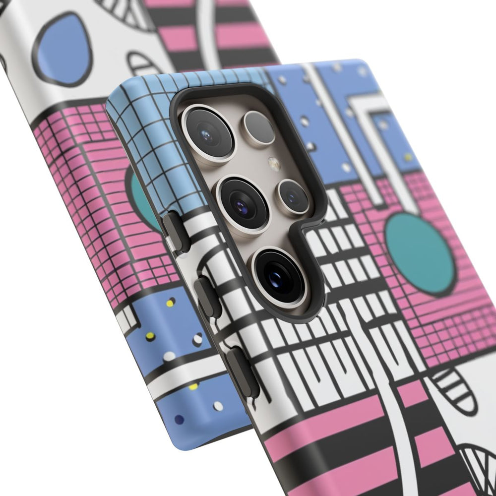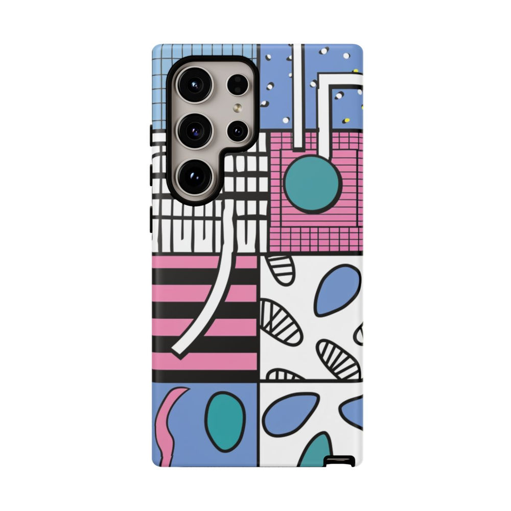 Dit hoesje heeft een kleurrijk abstract patroon met verschillende geometrische vormen en lijnen, gerangschikt in een raster. De vlakken zijn gevuld met diverse motieven zoals stippen, strepen, ruitjes en organische vormen in tinten roze, blauw, wit, zwart en teal. Het hoesje bestaat uit twee lagen met een matte afwerking: een stevige polycarbonaat buitenkant en een TPU binnenzijde voor extra stevigheid en bescherming. Ondersteunt draadloos opladen en is bestand tegen weersinvloeden.