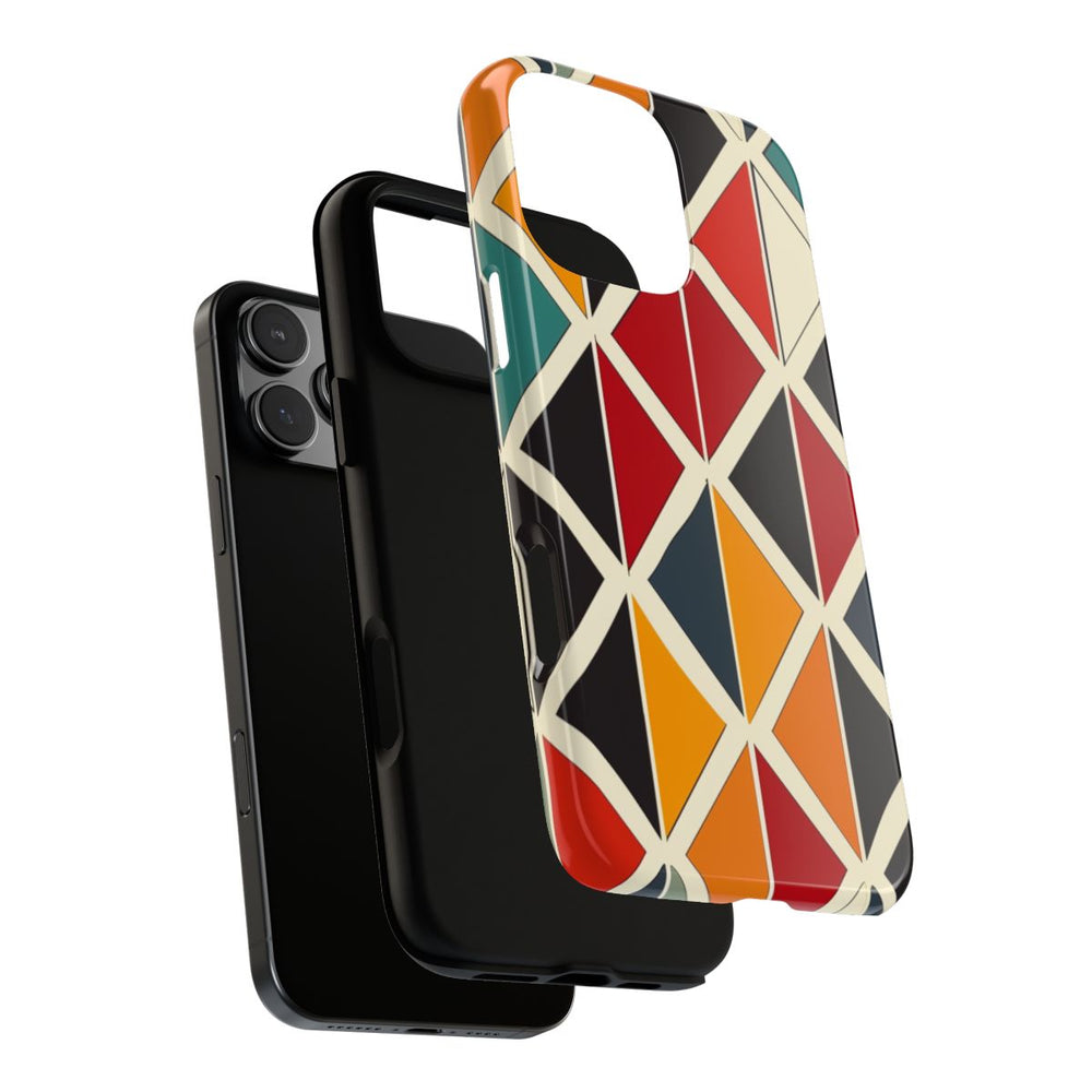 Dit telefoonhoesje heeft een opvallend geometrisch patroon van diamanten, waarbij elke diamant is verdeeld in twee driehoeken. De driehoeken zijn gevuld met effen kleuren zoals oranje, rood, teal, zwart, donkerblauw en beige. De diamanten zijn in een raster gerangschikt en worden gescheiden door dunne beige lijnen, wat zorgt voor een symmetrisch en stijlvol geheel. Het hoesje is glanzend en stevig, bestaat uit een polycarbonaat buitenkant en een TPU-binnenlaag, en biedt dubbele bescherming voor je toestel. Daarnaast is het hoesje geschikt voor draadloos opladen.
