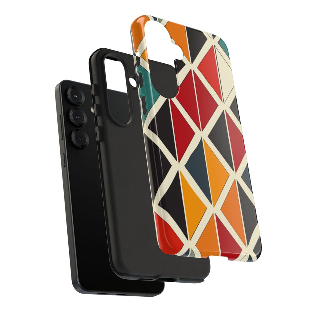 Dit telefoonhoesje heeft een opvallend geometrisch patroon van diamanten, waarbij elke diamant is verdeeld in twee driehoeken. De driehoeken zijn gevuld met effen kleuren zoals oranje, rood, teal, zwart, donkerblauw en beige. De diamanten zijn in een raster gerangschikt en worden gescheiden door dunne beige lijnen, wat zorgt voor een symmetrisch en stijlvol geheel. Het hoesje is glanzend en stevig, bestaat uit een polycarbonaat buitenkant en een TPU-binnenlaag, en biedt dubbele bescherming voor je toestel. Daarnaast is het hoesje geschikt voor draadloos opladen.