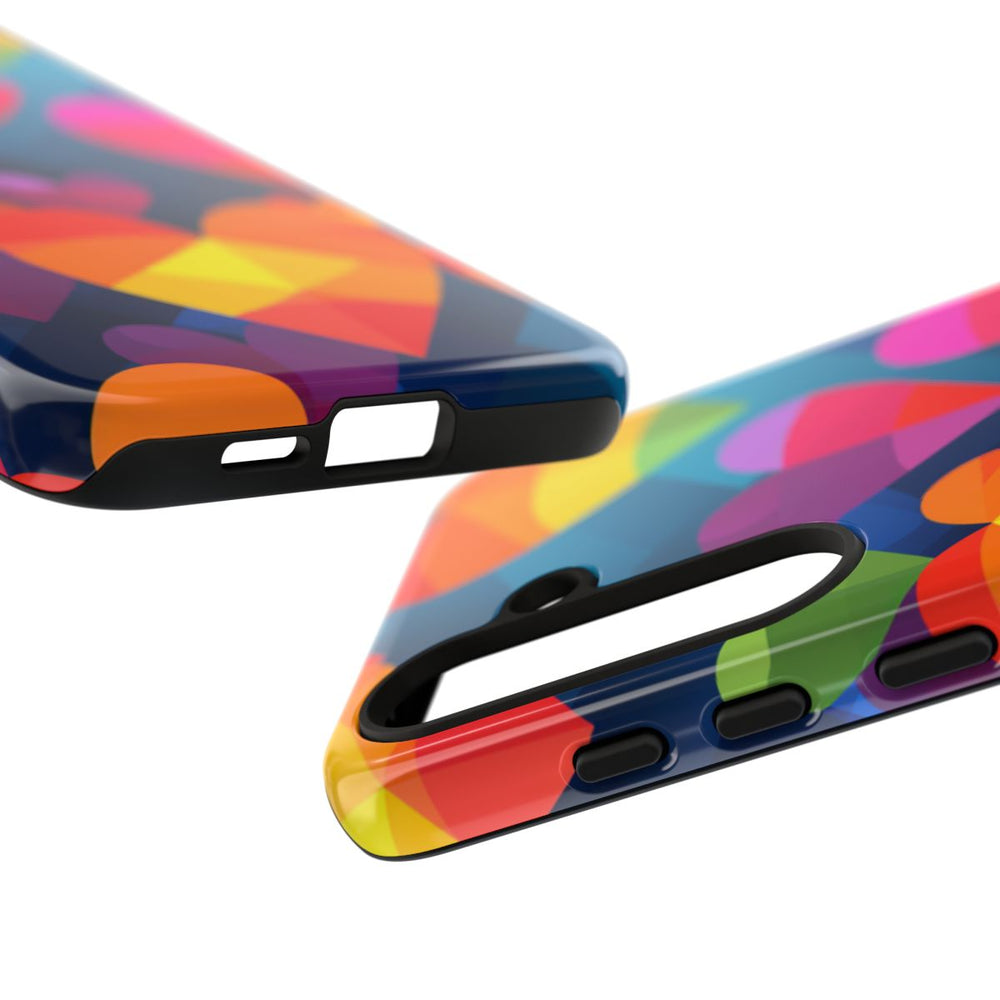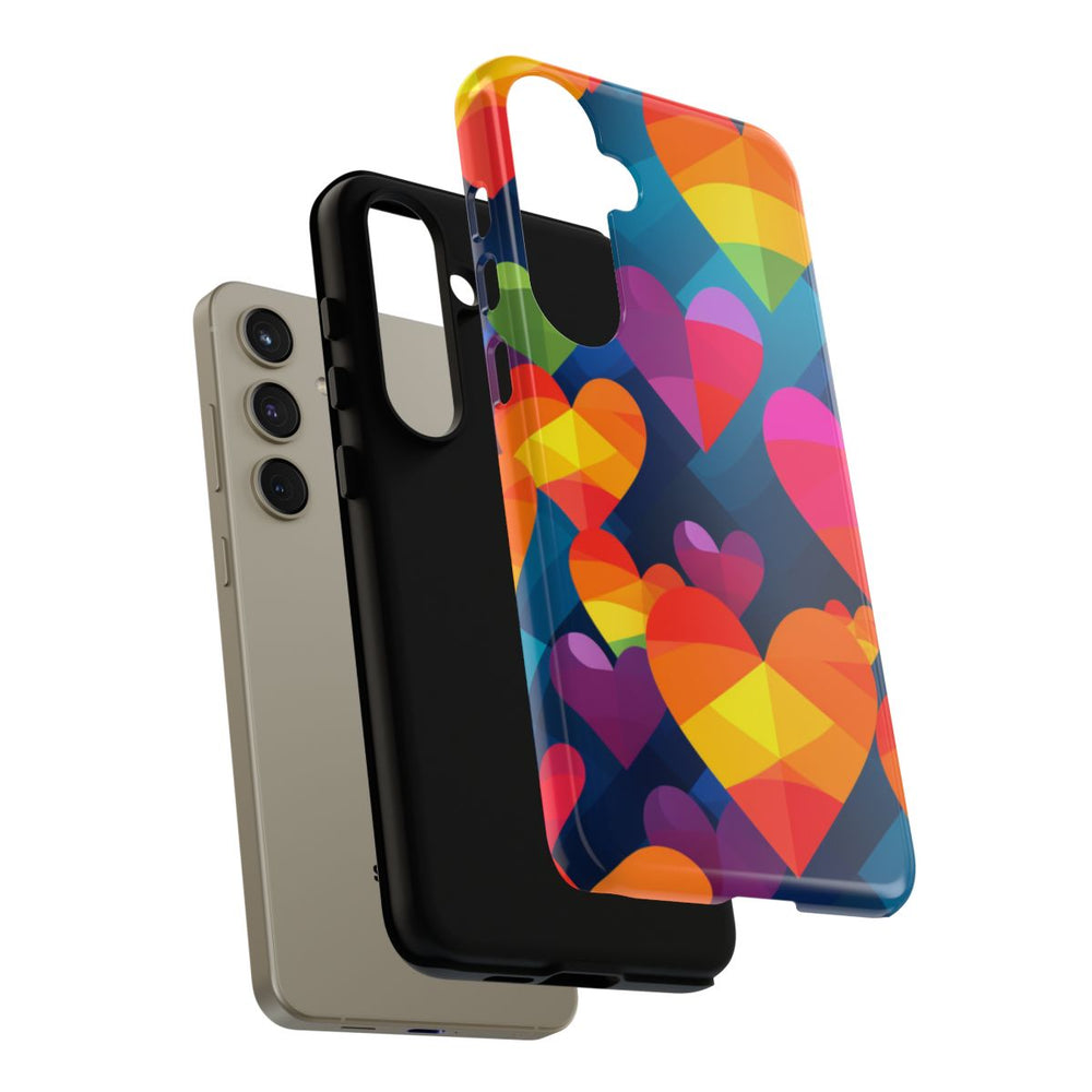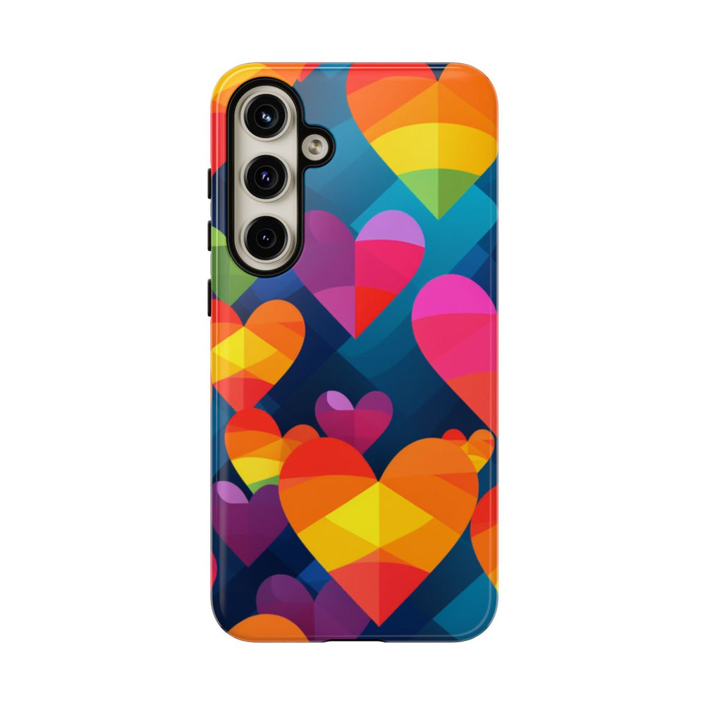 Dit hoesje is voorzien van een levendig patroon met geometrische harten in diverse maten en kleuren, zoals rood, oranje, geel, roze, paars, groen en blauw. De harten liggen over een donkerblauwe, getextureerde achtergrond met diagonale strepen, wat zorgt voor een speels en dynamisch effect. Het naadloos herhaalde patroon maakt dit hoesje tot een echte blikvanger. Het stevige, glanzende hoesje biedt dubbele bescherming en is geschikt voor draadloos opladen.