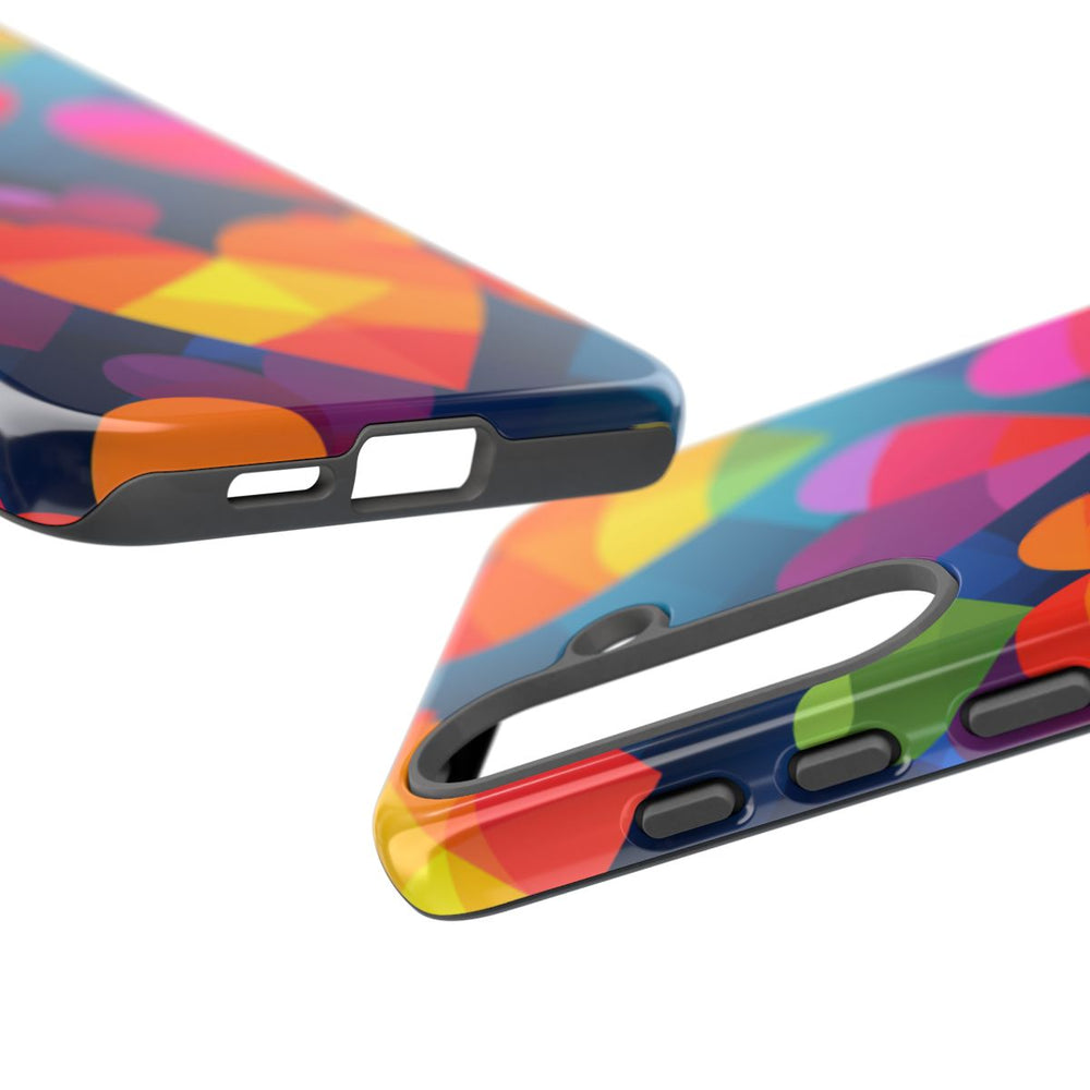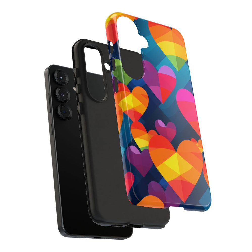Dit hoesje is voorzien van een levendig patroon met geometrische harten in diverse maten en kleuren, zoals rood, oranje, geel, roze, paars, groen en blauw. De harten liggen over een donkerblauwe, getextureerde achtergrond met diagonale strepen, wat zorgt voor een speels en dynamisch effect. Het naadloos herhaalde patroon maakt dit hoesje tot een echte blikvanger. Het stevige, glanzende hoesje biedt dubbele bescherming en is geschikt voor draadloos opladen.
