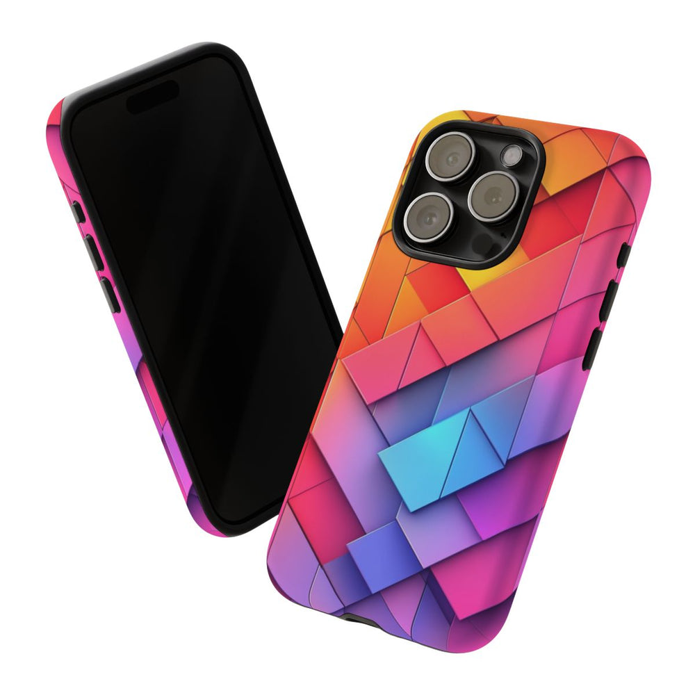 Dit telefoonhoesje heeft een opvallend geometrisch patroon met levendige kleuren en verschillende vormen en hoeken. De achtergrond loopt over in een spectrum van kleuren zoals roze, oranje, geel en blauw, wat zorgt voor een dynamisch en speels effect. Het moderne ontwerp springt direct in het oog en geeft je telefoon een stijlvolle uitstraling. Dankzij de dubbele laag biedt het hoesje extra bescherming en is het geschikt voor draadloos opladen.