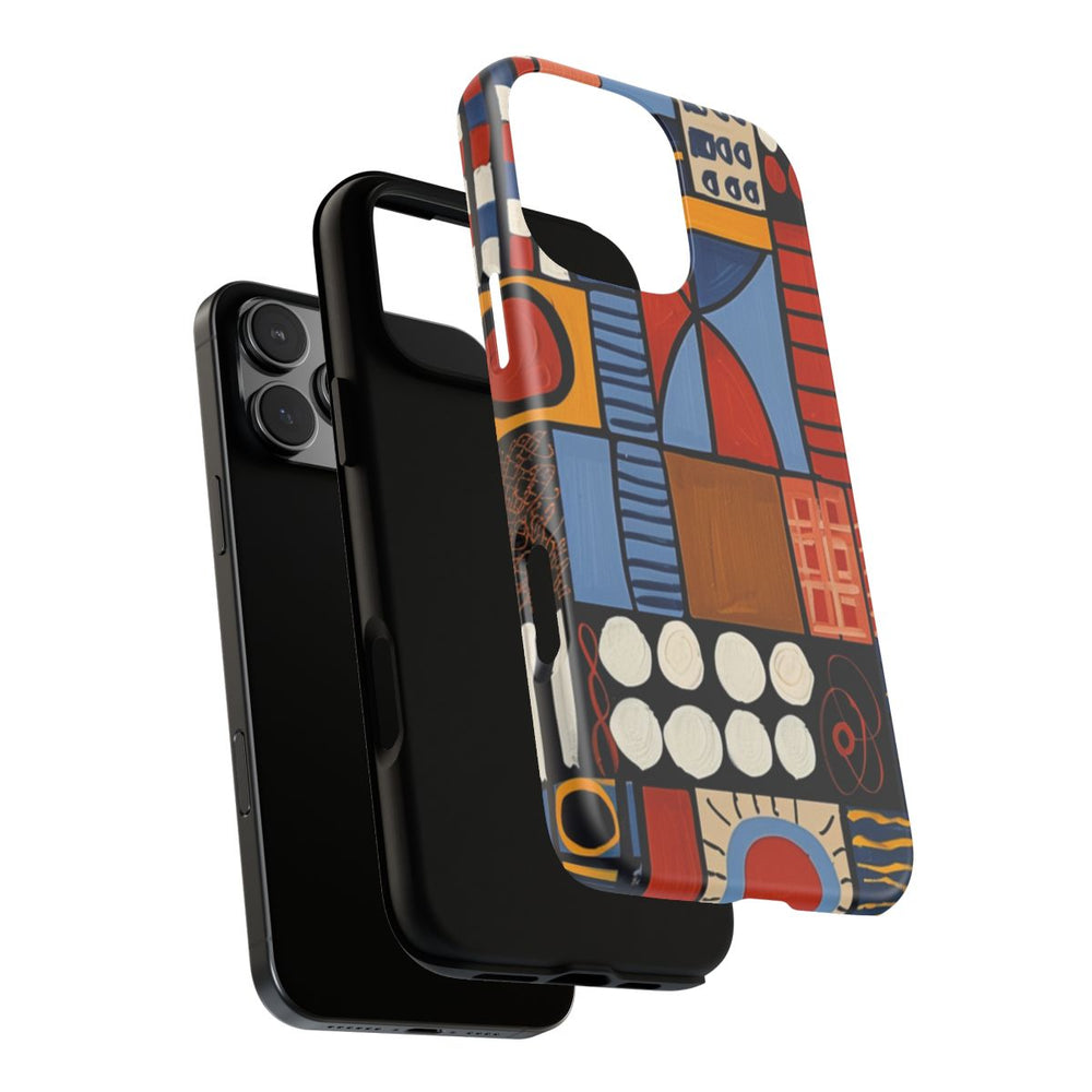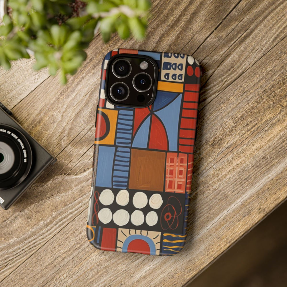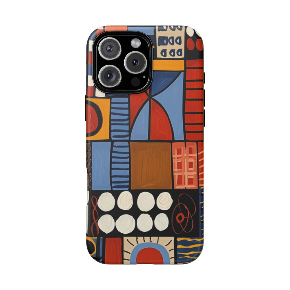 Dit hoesje heeft een levendig geometrisch patroon met verschillende rechthoeken en vierkanten, gevuld met abstracte vormen en lijnen. De kleuren bestaan uit tinten blauw, oranje, rood, wit en geel, die in een raster zijn gerangschikt. Het patroon bevat cirkels, kruisen, strepen en stippen, wat zorgt voor een dynamische en opvallende uitstraling. Het ontwerp is bedrukt op een mat hoesje van polycarbonaat en TPU, dat uit twee lagen bestaat voor extra bescherming en geschikt is voor draadloos opladen.