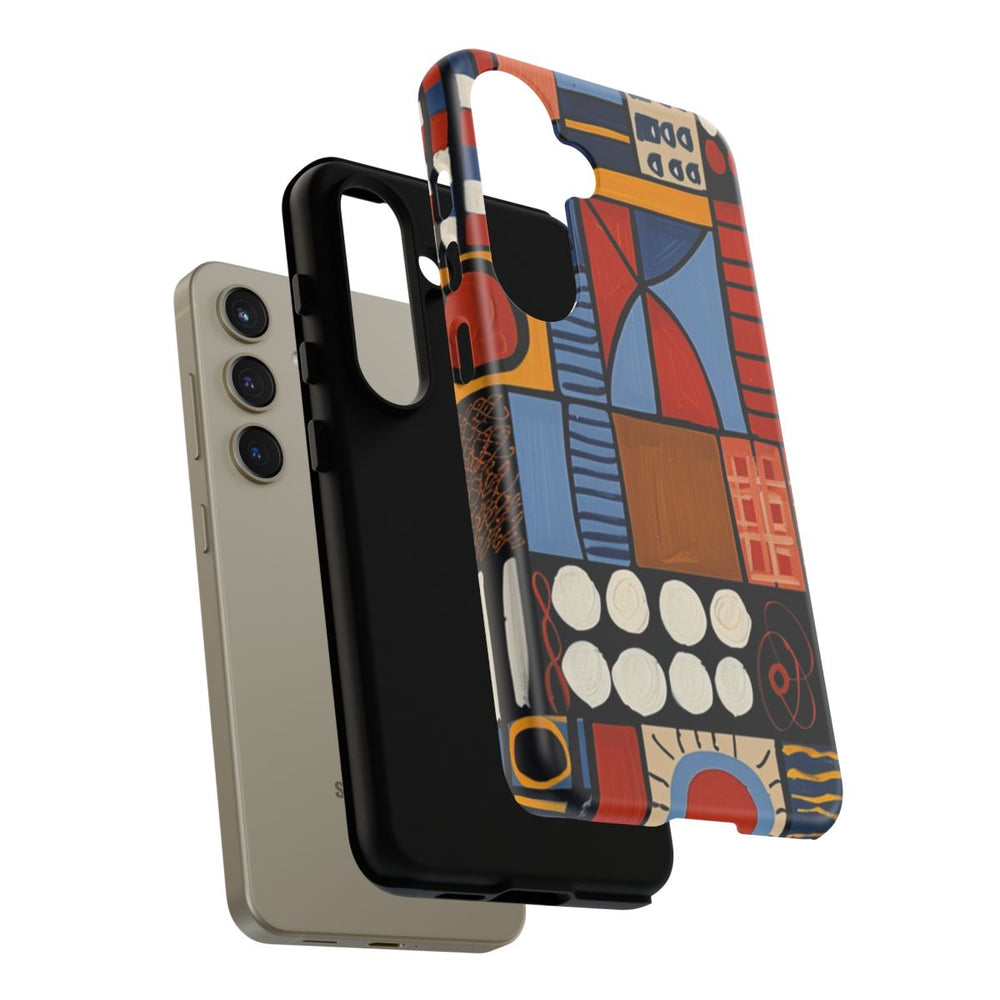 Dit hoesje heeft een levendig geometrisch patroon met verschillende rechthoeken en vierkanten, gevuld met abstracte vormen en lijnen. De kleuren bestaan uit tinten blauw, oranje, rood, wit en geel, die in een raster zijn gerangschikt. Het patroon bevat cirkels, kruisen, strepen en stippen, wat zorgt voor een dynamische en opvallende uitstraling. Het ontwerp is bedrukt op een mat hoesje van polycarbonaat en TPU, dat uit twee lagen bestaat voor extra bescherming en geschikt is voor draadloos opladen.