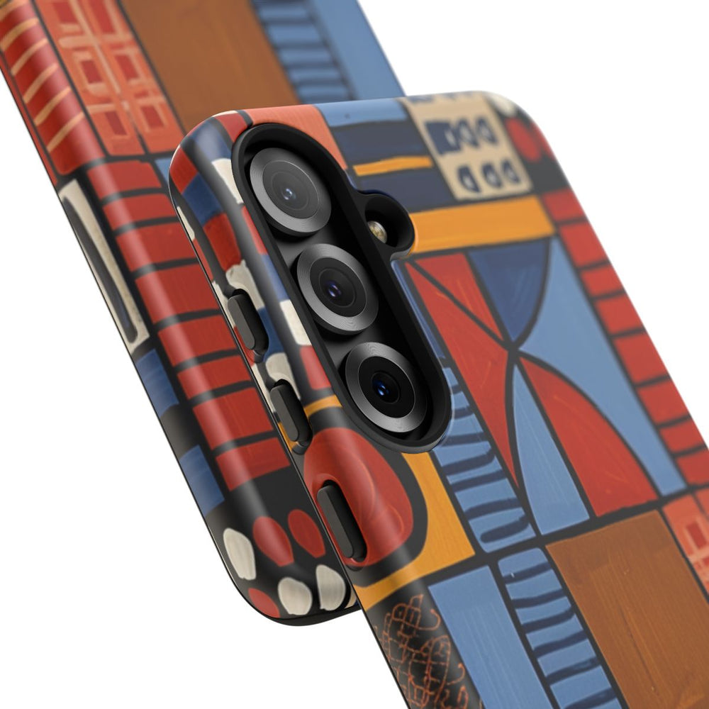 Dit hoesje heeft een levendig geometrisch patroon met verschillende rechthoeken en vierkanten, gevuld met abstracte vormen en lijnen. De kleuren bestaan uit tinten blauw, oranje, rood, wit en geel, die in een raster zijn gerangschikt. Het patroon bevat cirkels, kruisen, strepen en stippen, wat zorgt voor een dynamische en opvallende uitstraling. Het ontwerp is bedrukt op een mat hoesje van polycarbonaat en TPU, dat uit twee lagen bestaat voor extra bescherming en geschikt is voor draadloos opladen.