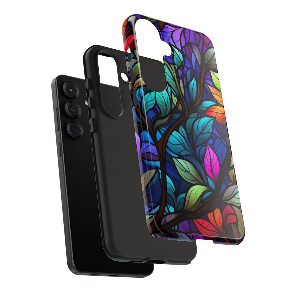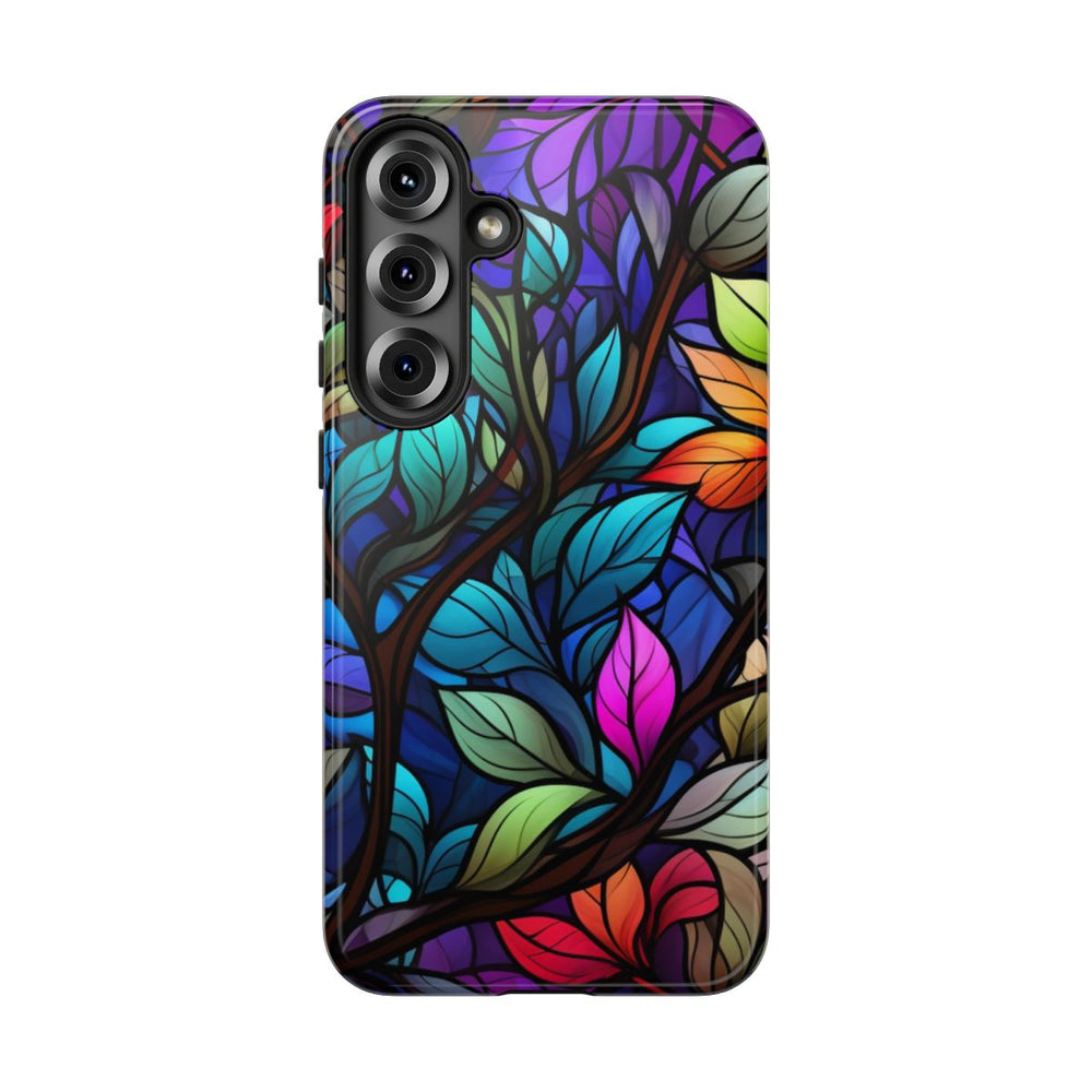 Dit hoesje heeft een levendig patroon van bladeren in glas-in-loodstijl, uitgevoerd in diverse kleuren zoals blauw, paars, rood, oranje, groen en roze. De bladeren zijn omlijnd met donkere lijnen, wat zorgt voor een mozaïekachtig effect dat doet denken aan glas-in-loodkunst. De achtergrond bestaat uit diepe tinten blauw en paars, waardoor de kleuren van de bladeren extra opvallen. Het glanzende, stevige hoesje is gemaakt met een dubbele laag voor optimale stevigheid en bescherming, en ondersteunt draadloos opladen.