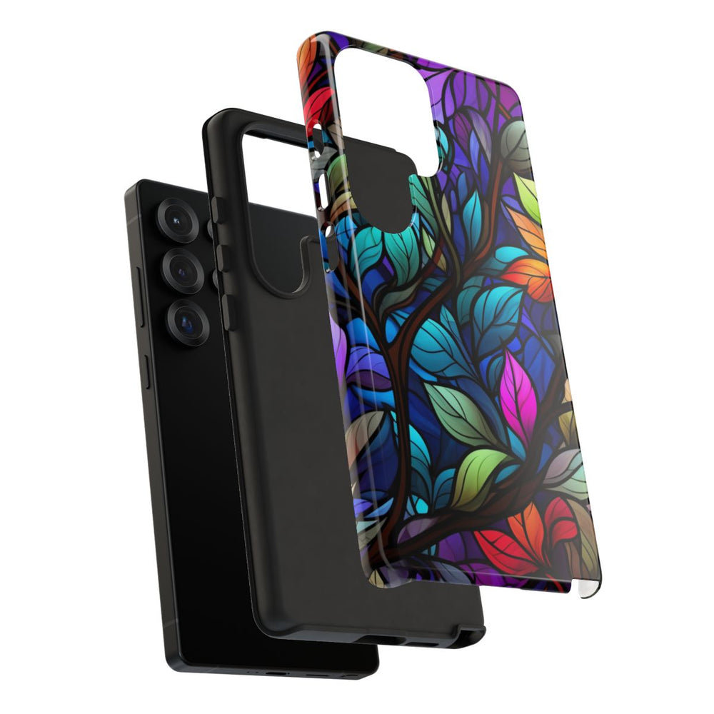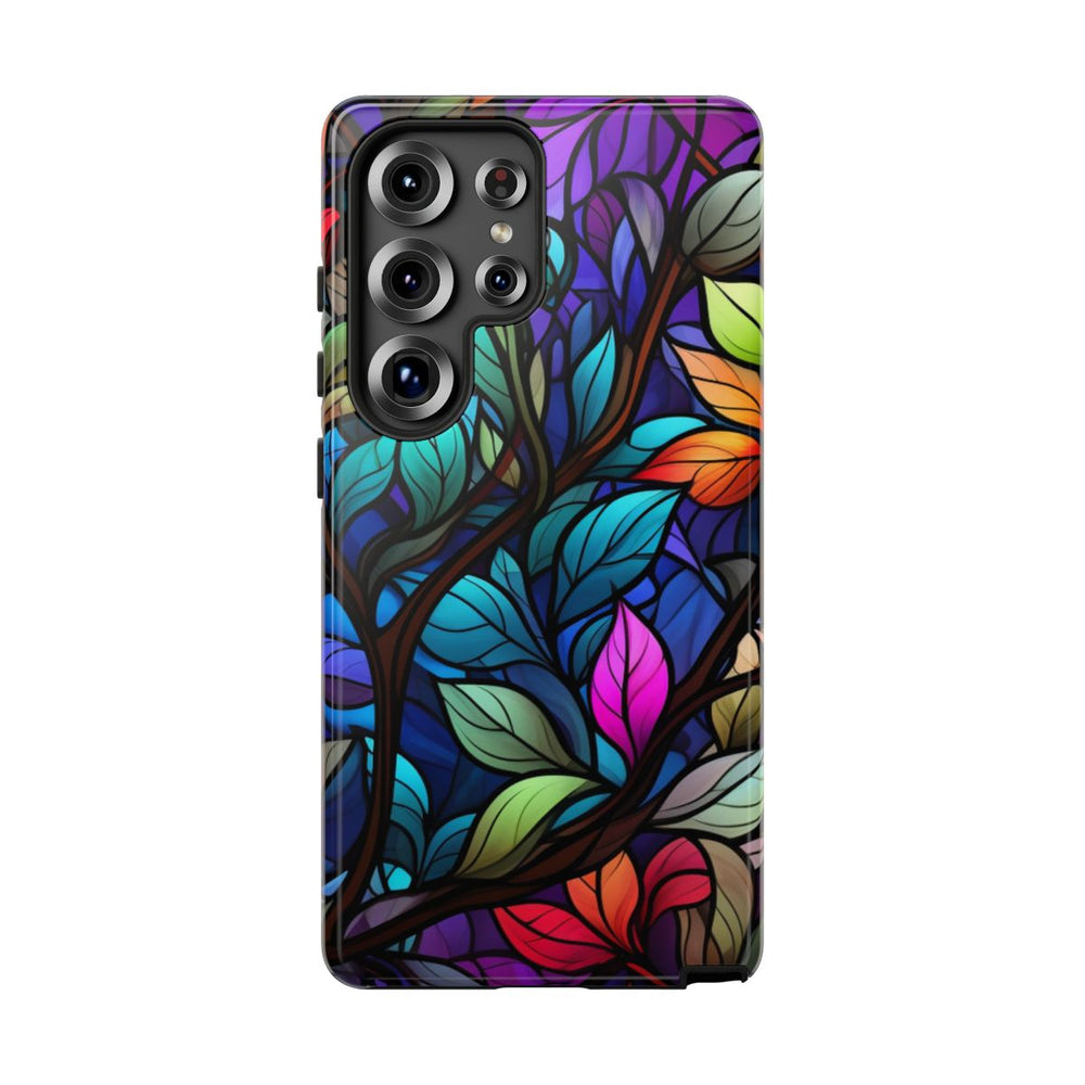 Dit hoesje heeft een levendig patroon van bladeren in glas-in-loodstijl, uitgevoerd in diverse kleuren zoals blauw, paars, rood, oranje, groen en roze. De bladeren zijn omlijnd met donkere lijnen, wat zorgt voor een mozaïekachtig effect dat doet denken aan glas-in-loodkunst. De achtergrond bestaat uit diepe tinten blauw en paars, waardoor de kleuren van de bladeren extra opvallen. Het glanzende, stevige hoesje is gemaakt met een dubbele laag voor optimale stevigheid en bescherming, en ondersteunt draadloos opladen.