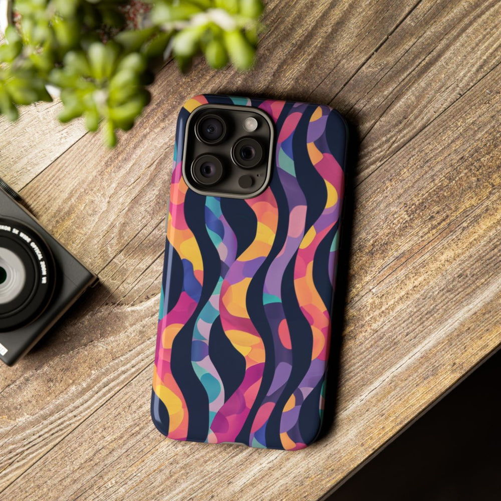 Dit hoesje heeft een opvallend abstract patroon met golvende verticale strepen in verschillende kleuren, waaronder tinten paars, roze, geel, oranje, blauw en turquoise. De golven zorgen voor een vloeiend en dynamisch effect op een donkere achtergrond. Het patroon loopt naadloos door en geeft het hoesje een levendige, energieke uitstraling. Het hoesje is glanzend afgewerkt en bestaat uit een stevige dubbele laag met een polycarbonaat buitenkant en een TPU-voering. Zo biedt het optimale bescherming en is het geschikt voor draadloos opladen.