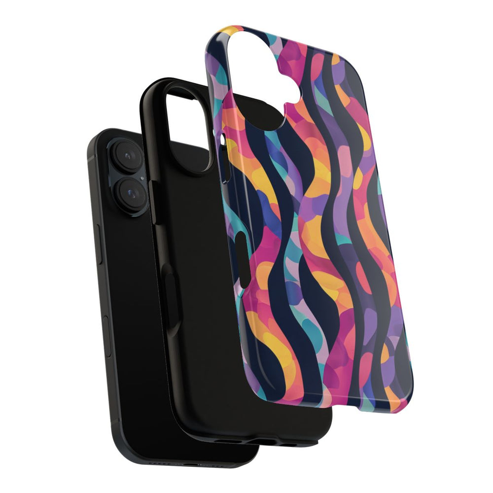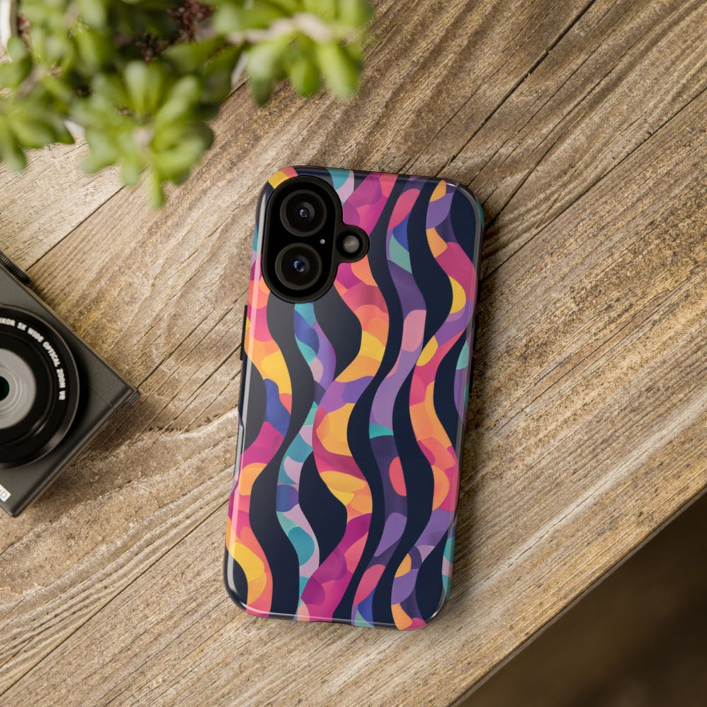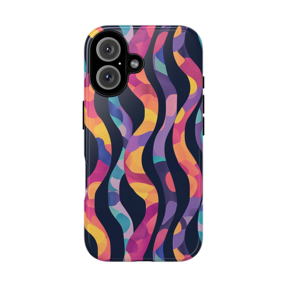 Dit hoesje heeft een opvallend abstract patroon met golvende verticale strepen in verschillende kleuren, waaronder tinten paars, roze, geel, oranje, blauw en turquoise. De golven zorgen voor een vloeiend en dynamisch effect op een donkere achtergrond. Het patroon loopt naadloos door en geeft het hoesje een levendige, energieke uitstraling. Het hoesje is glanzend afgewerkt en bestaat uit een stevige dubbele laag met een polycarbonaat buitenkant en een TPU-voering. Zo biedt het optimale bescherming en is het geschikt voor draadloos opladen.