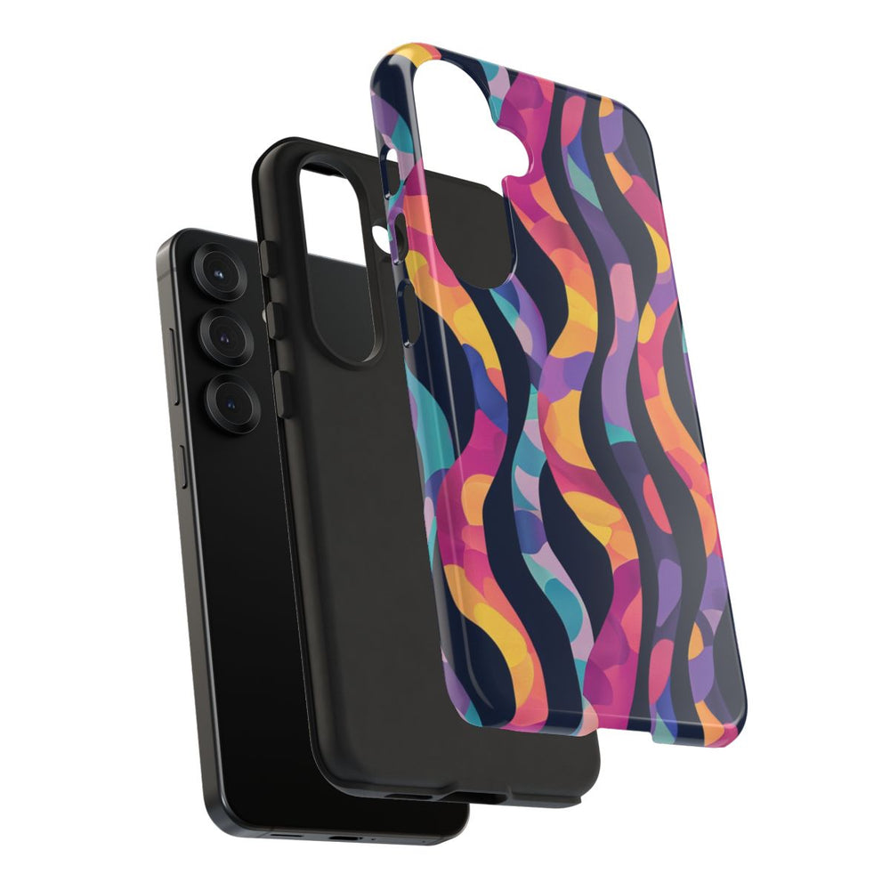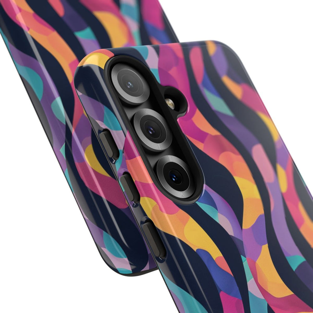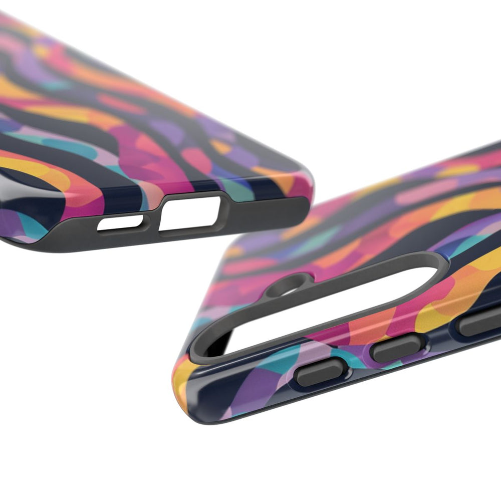 Dit hoesje heeft een opvallend abstract patroon met golvende verticale strepen in verschillende kleuren, waaronder tinten paars, roze, geel, oranje, blauw en turquoise. De golven zorgen voor een vloeiend en dynamisch effect op een donkere achtergrond. Het patroon loopt naadloos door en geeft het hoesje een levendige, energieke uitstraling. Het hoesje is glanzend afgewerkt en bestaat uit een stevige dubbele laag met een polycarbonaat buitenkant en een TPU-voering. Zo biedt het optimale bescherming en is het geschikt voor draadloos opladen.
