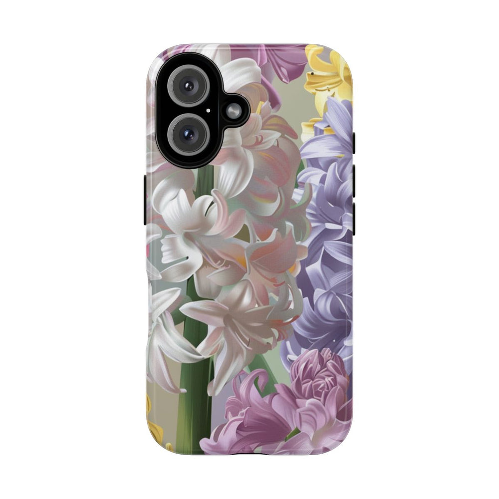 Dit hoesje is bedrukt met een doorlopend patroon van hyacinten in diverse pasteltinten, zoals paars, roze, geel en wit. De bloemen zijn gedetailleerd weergegeven met zachte, sierlijke bloemblaadjes en groene stelen, wat zorgt voor een levendige en elegante uitstraling. Het patroon is aangebracht op een glanzend en stevig hoesje met een dubbele laag: een polycarbonaat buitenkant en een TPU-binnenzijde. Hierdoor is het hoesje duurzaam en biedt het uitstekende bescherming. Het hoesje ondersteunt draadloos opladen en is bestand tegen invloeden van buitenaf.