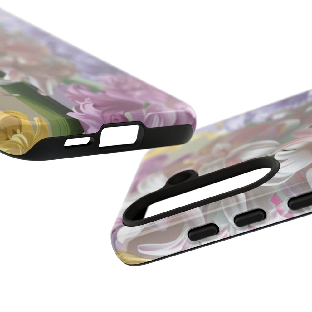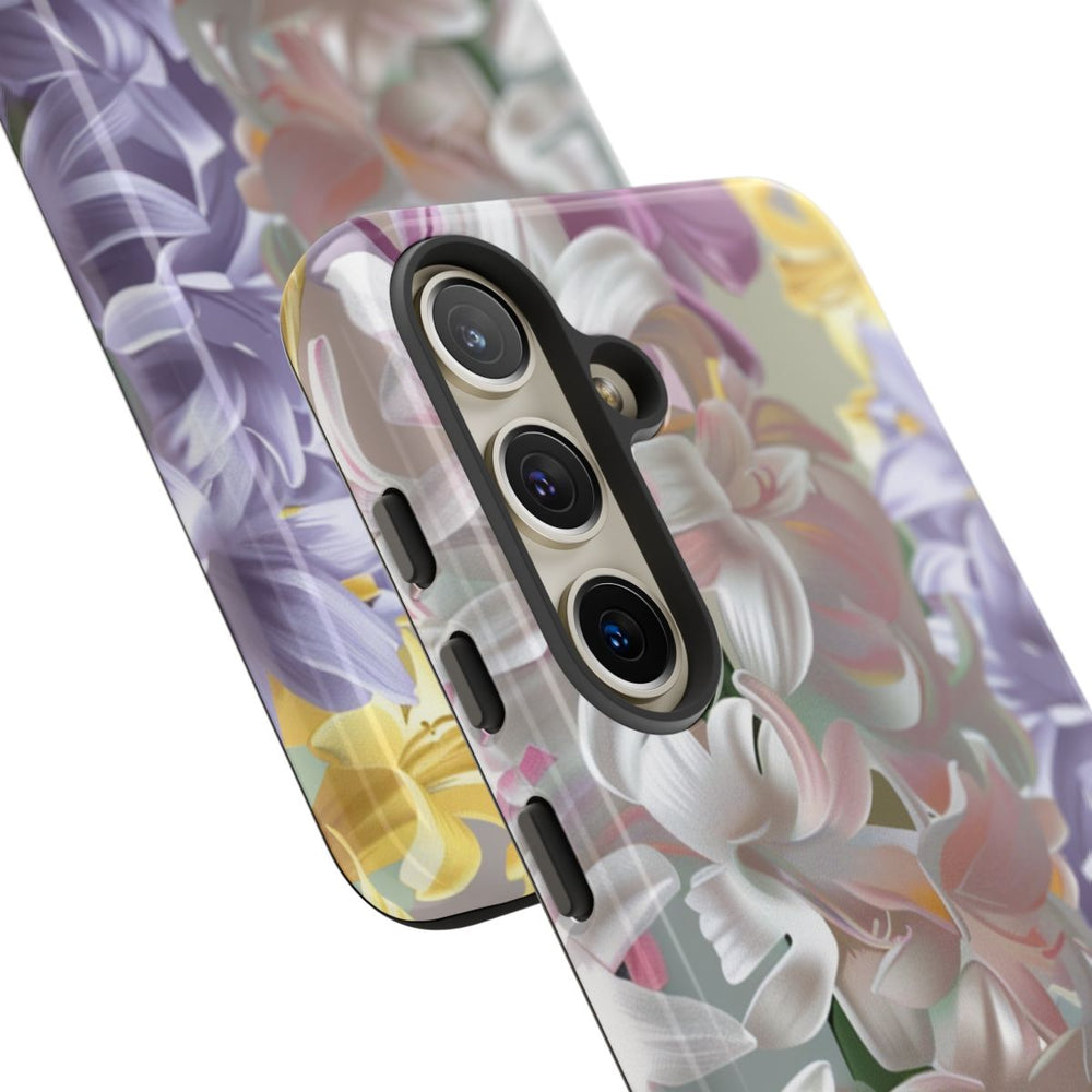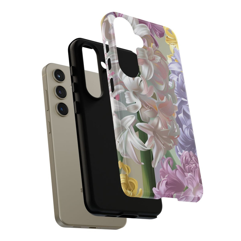 Dit hoesje is bedrukt met een doorlopend patroon van hyacinten in diverse pasteltinten, zoals paars, roze, geel en wit. De bloemen zijn gedetailleerd weergegeven met zachte, sierlijke bloemblaadjes en groene stelen, wat zorgt voor een levendige en elegante uitstraling. Het patroon is aangebracht op een glanzend en stevig hoesje met een dubbele laag: een polycarbonaat buitenkant en een TPU-binnenzijde. Hierdoor is het hoesje duurzaam en biedt het uitstekende bescherming. Het hoesje ondersteunt draadloos opladen en is bestand tegen invloeden van buitenaf.