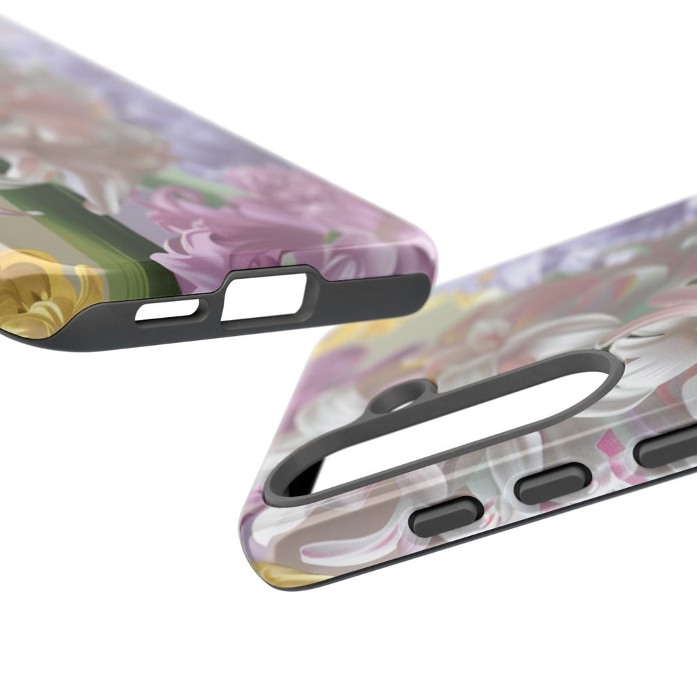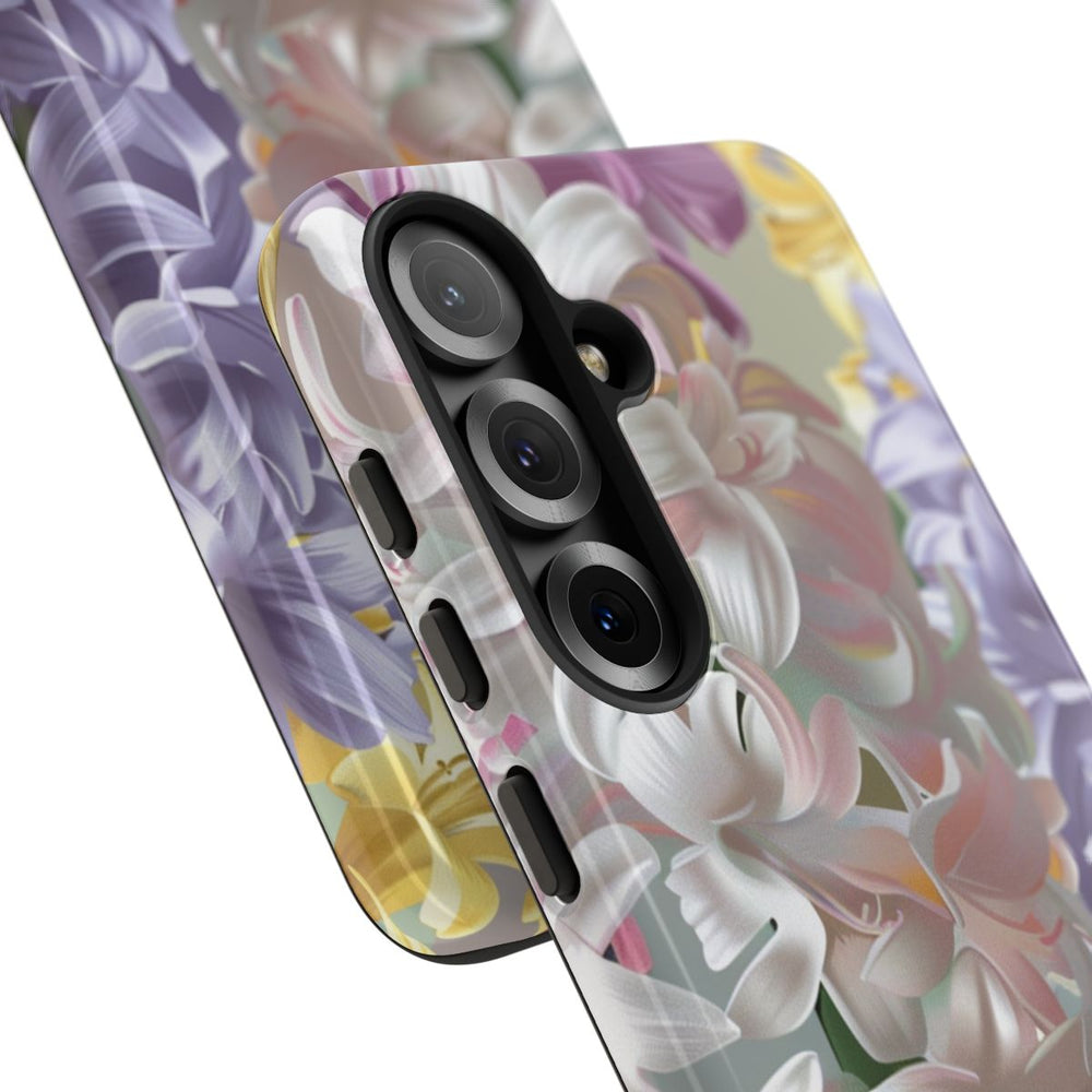 Dit hoesje is bedrukt met een doorlopend patroon van hyacinten in diverse pasteltinten, zoals paars, roze, geel en wit. De bloemen zijn gedetailleerd weergegeven met zachte, sierlijke bloemblaadjes en groene stelen, wat zorgt voor een levendige en elegante uitstraling. Het patroon is aangebracht op een glanzend en stevig hoesje met een dubbele laag: een polycarbonaat buitenkant en een TPU-binnenzijde. Hierdoor is het hoesje duurzaam en biedt het uitstekende bescherming. Het hoesje ondersteunt draadloos opladen en is bestand tegen invloeden van buitenaf.