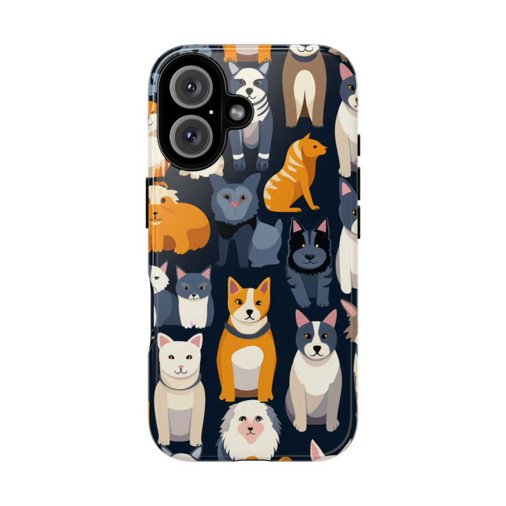 Dit telefoonhoesje heeft een speels patroon van verschillende katten en honden, geïllustreerd in een vrolijke, kleurrijke stijl. De dieren staan dicht bij elkaar op een donkerblauwe achtergrond en tonen diverse rassen en kleuren zoals oranje, grijs, wit en zwart. Het ontwerp is levendig en opvallend, perfect voor wie van dieren houdt. Het hoesje is voorzien van een stevige polycarbonaat buitenkant en een TPU binnenzijde, wat zorgt voor extra bescherming en duurzaamheid. Daarnaast ondersteunt het hoesje draadloos opladen.