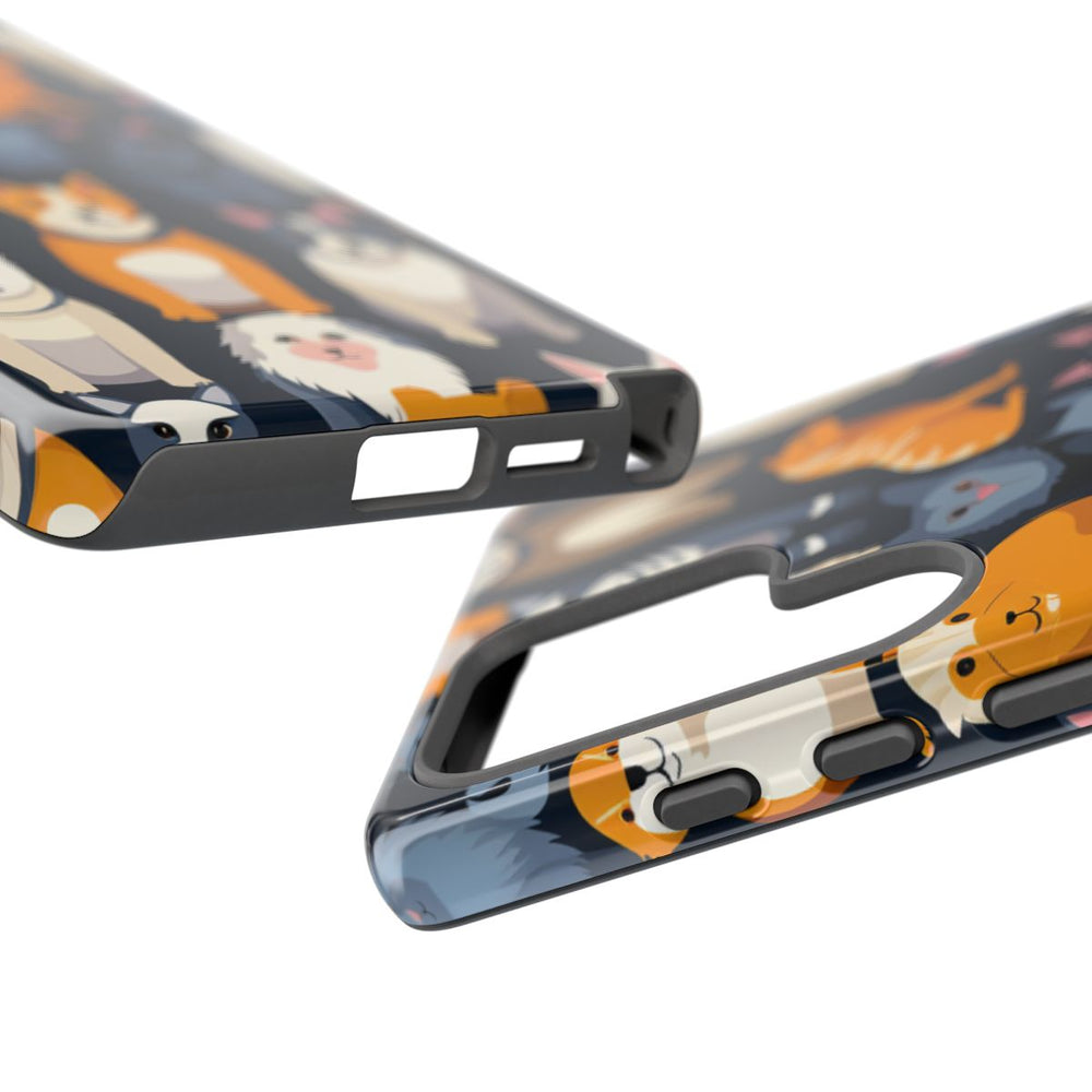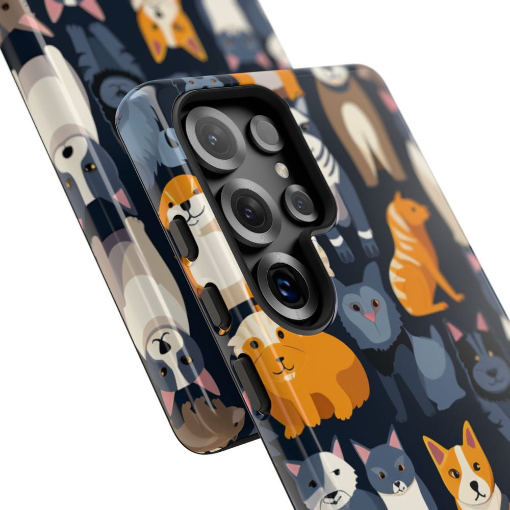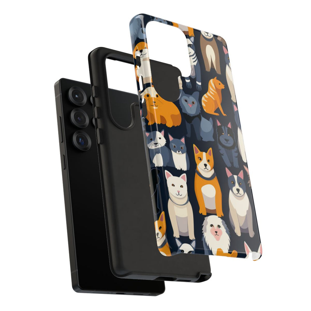 Dit telefoonhoesje heeft een speels patroon van verschillende katten en honden, geïllustreerd in een vrolijke, kleurrijke stijl. De dieren staan dicht bij elkaar op een donkerblauwe achtergrond en tonen diverse rassen en kleuren zoals oranje, grijs, wit en zwart. Het ontwerp is levendig en opvallend, perfect voor wie van dieren houdt. Het hoesje is voorzien van een stevige polycarbonaat buitenkant en een TPU binnenzijde, wat zorgt voor extra bescherming en duurzaamheid. Daarnaast ondersteunt het hoesje draadloos opladen.