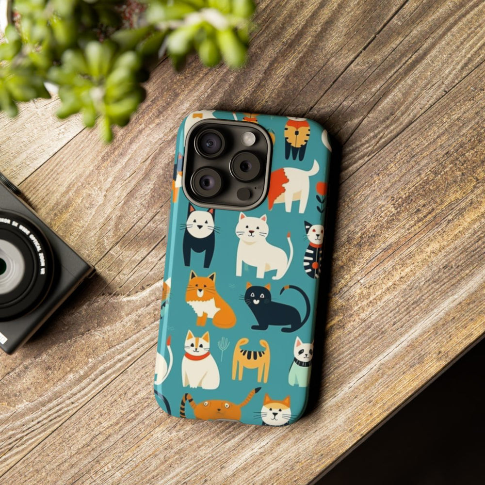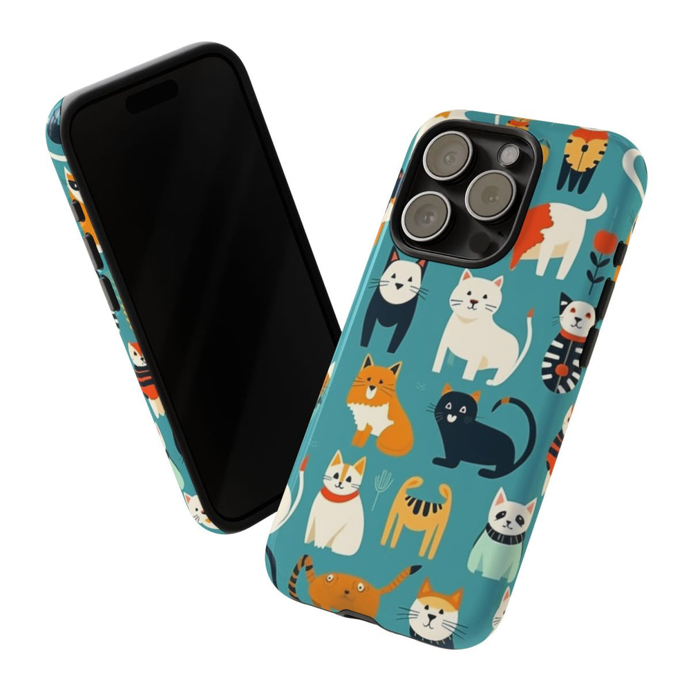 Dit telefoonhoesje is versierd met een herhalend patroon van diverse gestileerde katten in verschillende houdingen en kleuren. De katten zijn getekend in een speelse, eenvoudige stijl met duidelijke lijnen en vormen. De effen teal achtergrond laat de oranje, zwarte, witte en crèmekleurige katten extra opvallen. Tussen de katten zijn kleine bloemen verwerkt voor een decoratief accent. Het hoesje heeft een glanzende afwerking en bestaat uit twee lagen voor optimale bescherming. Geschikt voor draadloos opladen.