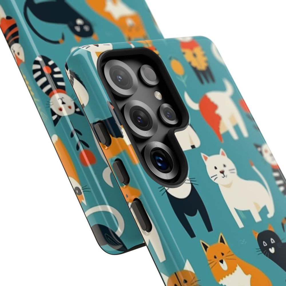 Dit telefoonhoesje is versierd met een herhalend patroon van diverse gestileerde katten in verschillende houdingen en kleuren. De katten zijn getekend in een speelse, eenvoudige stijl met duidelijke lijnen en vormen. De effen teal achtergrond laat de oranje, zwarte, witte en crèmekleurige katten extra opvallen. Tussen de katten zijn kleine bloemen verwerkt voor een decoratief accent. Het hoesje heeft een glanzende afwerking en bestaat uit twee lagen voor optimale bescherming. Geschikt voor draadloos opladen.