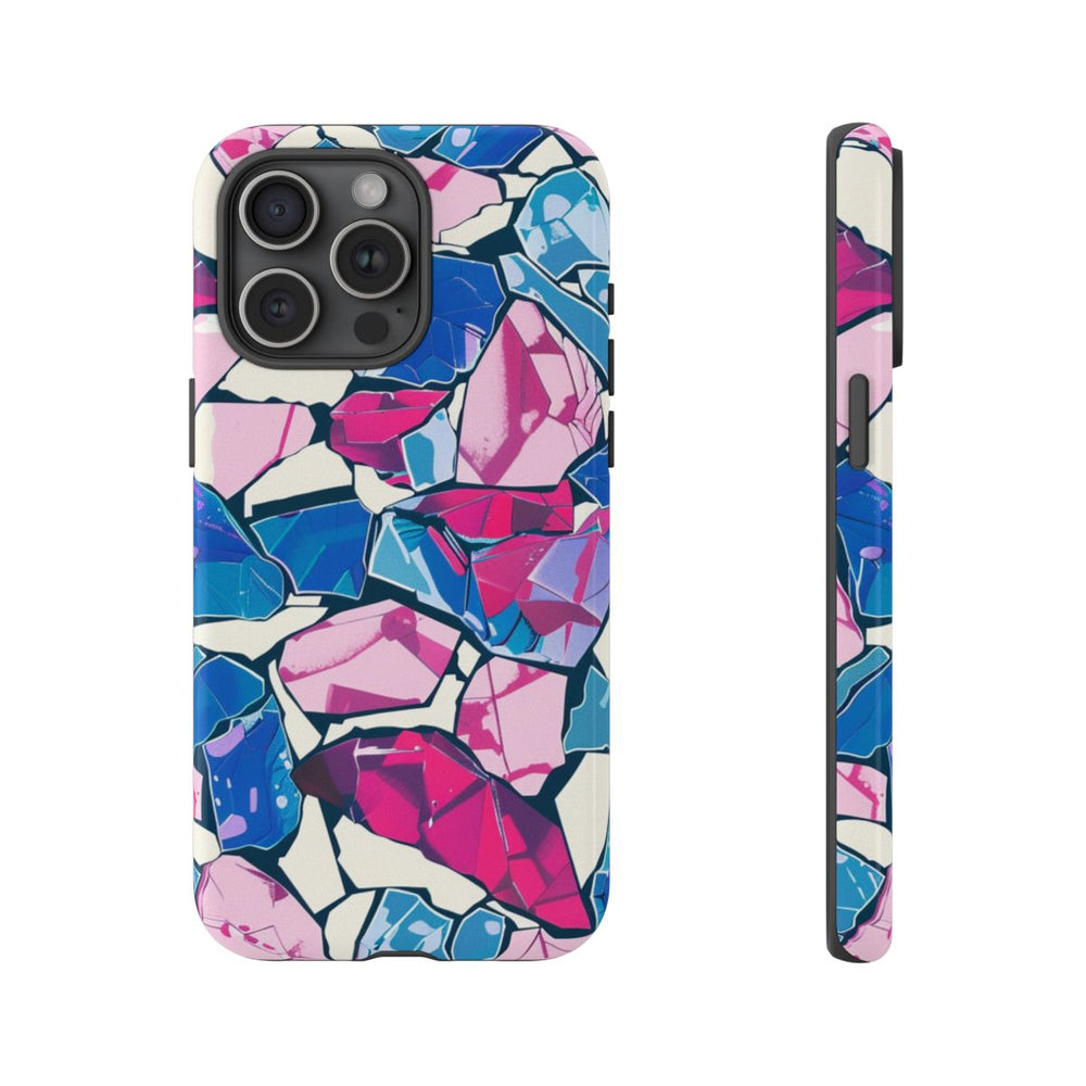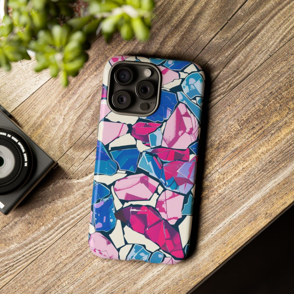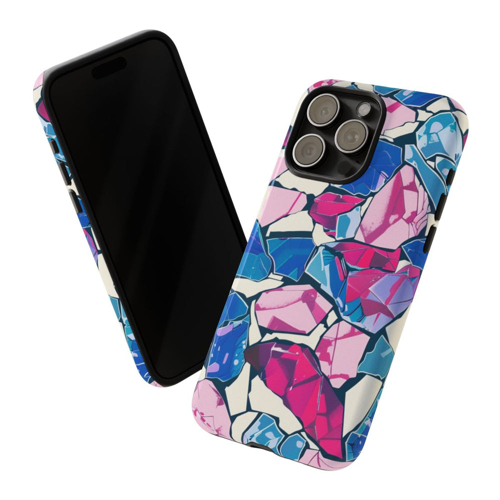 Dit telefoonhoesje is voorzien van een levendig patroon met kristalachtige vormen in blauw-, roze- en paarstinten. De onregelmatige vormen liggen dicht bij elkaar en worden gescheiden door donkere lijnen. De lichte crèmekleurige achtergrond laat de heldere kleuren van de kristallen extra opvallen. Het hoesje heeft een glanzende afwerking en bestaat uit een stevige dubbele laag met een polycarbonaat buitenkant en een TPU-binnenzijde. Dit zorgt voor optimale bescherming en duurzaamheid. Het hoesje ondersteunt draadloos opladen.