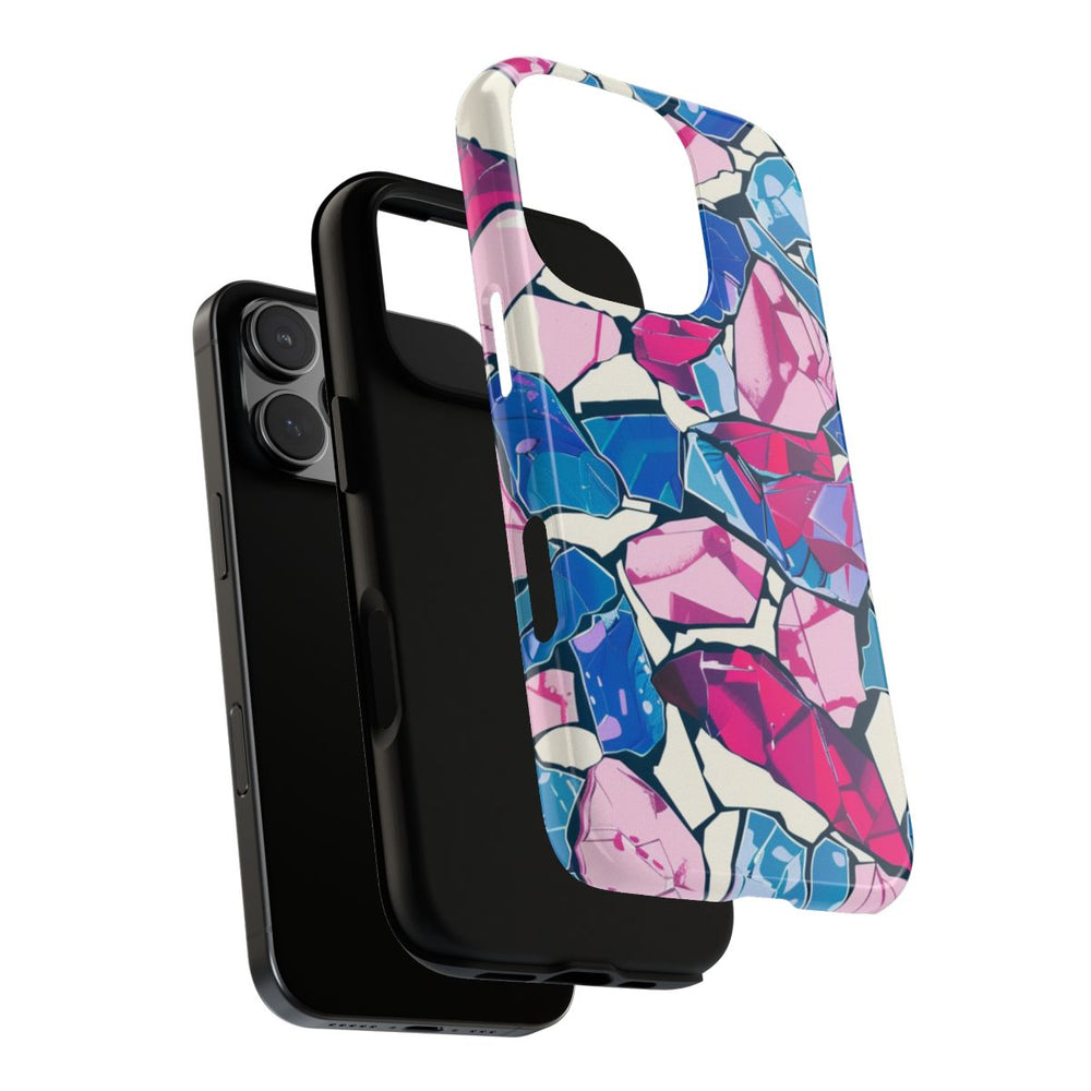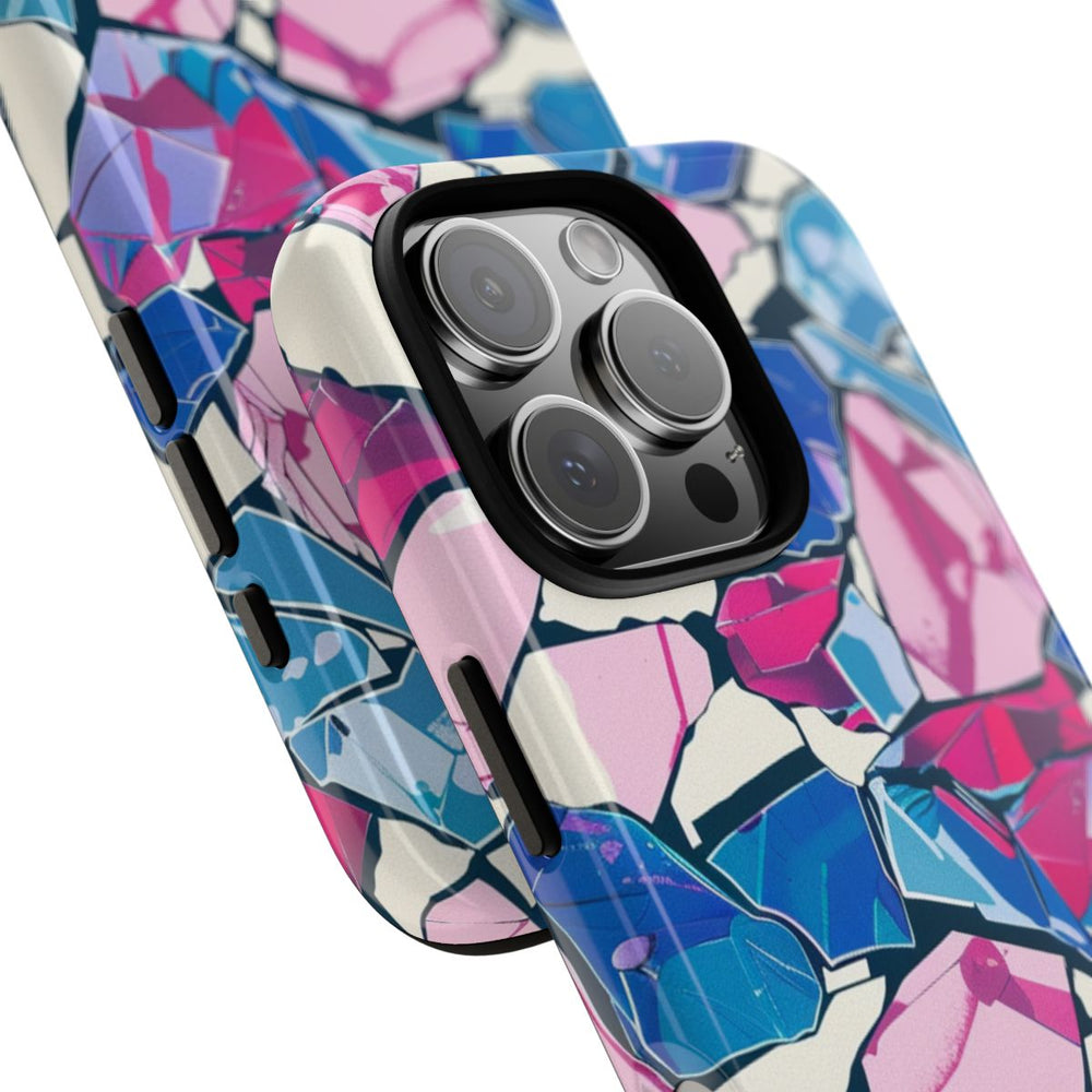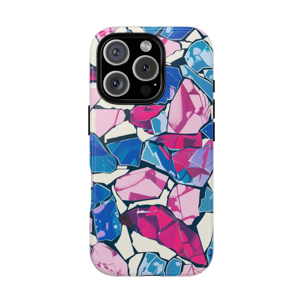 Dit telefoonhoesje is voorzien van een levendig patroon met kristalachtige vormen in blauw-, roze- en paarstinten. De onregelmatige vormen liggen dicht bij elkaar en worden gescheiden door donkere lijnen. De lichte crèmekleurige achtergrond laat de heldere kleuren van de kristallen extra opvallen. Het hoesje heeft een glanzende afwerking en bestaat uit een stevige dubbele laag met een polycarbonaat buitenkant en een TPU-binnenzijde. Dit zorgt voor optimale bescherming en duurzaamheid. Het hoesje ondersteunt draadloos opladen.