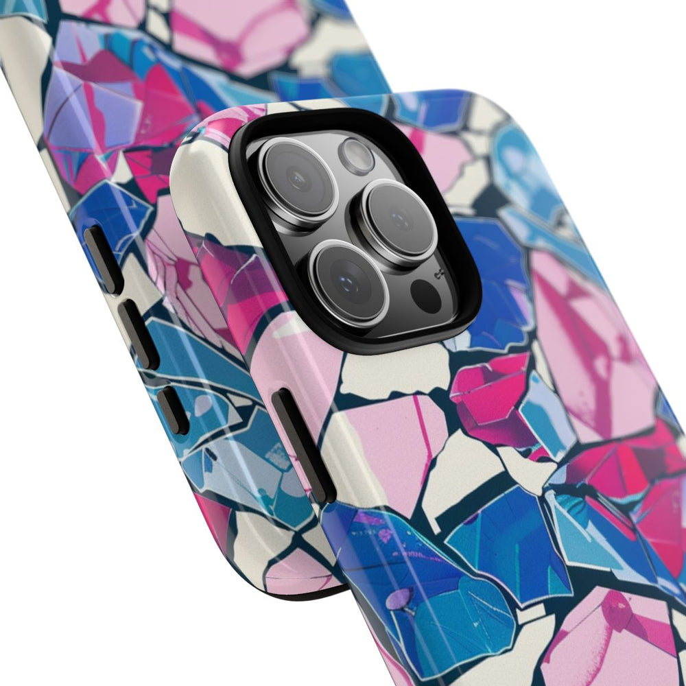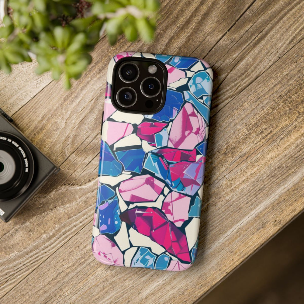 Dit telefoonhoesje is voorzien van een levendig patroon met kristalachtige vormen in blauw-, roze- en paarstinten. De onregelmatige vormen liggen dicht bij elkaar en worden gescheiden door donkere lijnen. De lichte crèmekleurige achtergrond laat de heldere kleuren van de kristallen extra opvallen. Het hoesje heeft een glanzende afwerking en bestaat uit een stevige dubbele laag met een polycarbonaat buitenkant en een TPU-binnenzijde. Dit zorgt voor optimale bescherming en duurzaamheid. Het hoesje ondersteunt draadloos opladen.