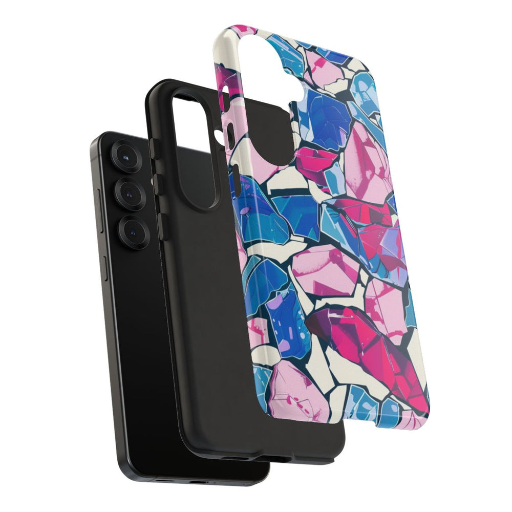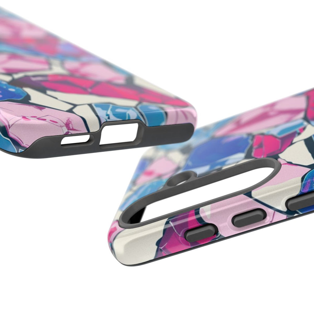 Dit telefoonhoesje is voorzien van een levendig patroon met kristalachtige vormen in blauw-, roze- en paarstinten. De onregelmatige vormen liggen dicht bij elkaar en worden gescheiden door donkere lijnen. De lichte crèmekleurige achtergrond laat de heldere kleuren van de kristallen extra opvallen. Het hoesje heeft een glanzende afwerking en bestaat uit een stevige dubbele laag met een polycarbonaat buitenkant en een TPU-binnenzijde. Dit zorgt voor optimale bescherming en duurzaamheid. Het hoesje ondersteunt draadloos opladen.