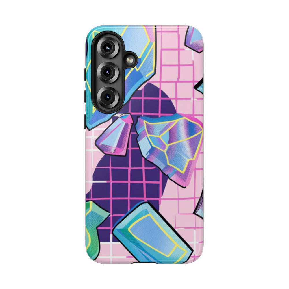 Dit ontwerp toont een levendig patroon van gestileerde kristallen in blauwe, paarse en roze tinten. De kristallen hebben geometrische facetten die worden geaccentueerd met gele omlijningen en zwarte schaduwen, wat zorgt voor een dynamische en ruimtelijke uitstraling. De achtergrond bestaat uit een rasterpatroon in roze en paarse kleuren, wat een retro en abstract effect geeft. Het patroon loopt naadloos door, waardoor het perfect is voor een glanzend en stevig hoesje dat bescherming biedt en geschikt is voor draadloos opladen.