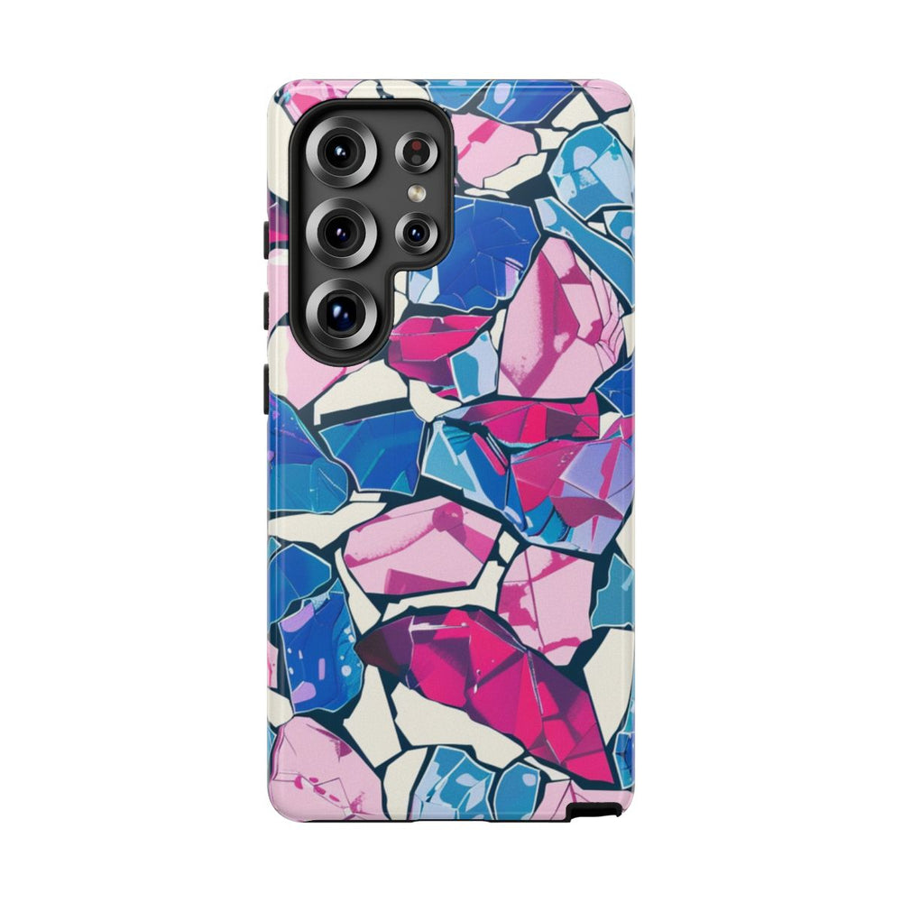 Dit telefoonhoesje is voorzien van een levendig patroon met kristalachtige vormen in blauw-, roze- en paarstinten. De onregelmatige vormen liggen dicht bij elkaar en worden gescheiden door donkere lijnen. De lichte crèmekleurige achtergrond laat de heldere kleuren van de kristallen extra opvallen. Het hoesje heeft een glanzende afwerking en bestaat uit een stevige dubbele laag met een polycarbonaat buitenkant en een TPU-binnenzijde. Dit zorgt voor optimale bescherming en duurzaamheid. Het hoesje ondersteunt draadloos opladen.