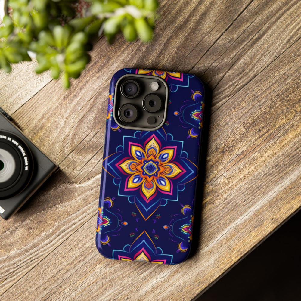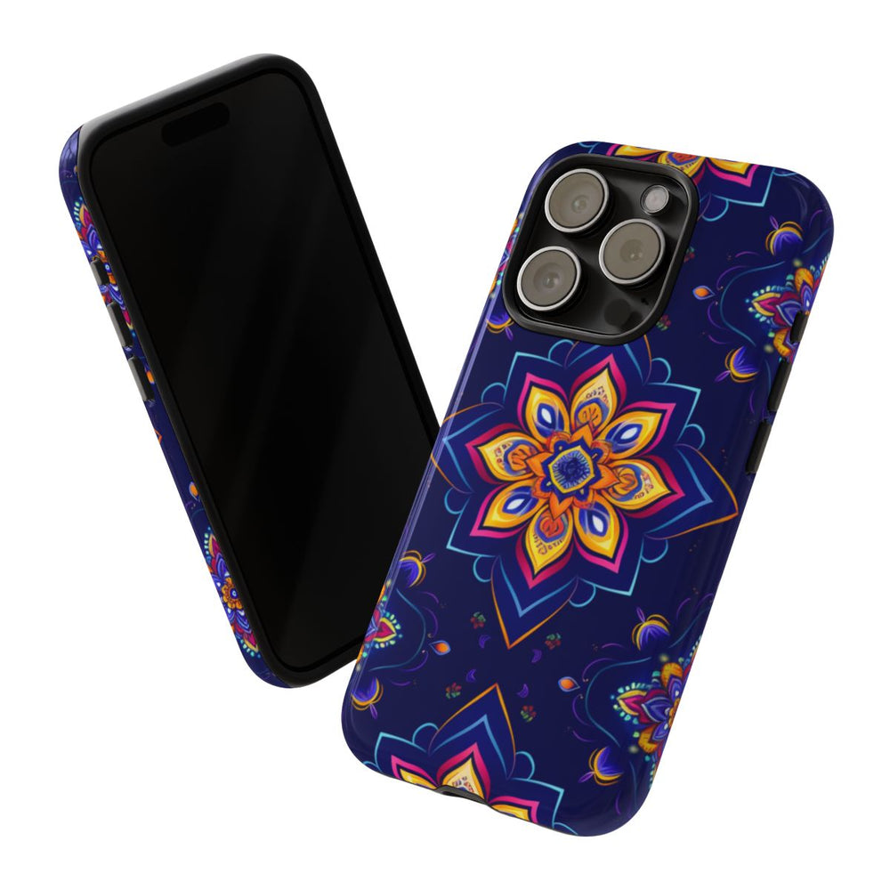 Dit hoesje heeft een naadloos patroon van levendige mandala’s met bloemmotieven op een donkerblauwe achtergrond. De mandala’s bestaan uit verfijnde vormen en opvallende kleuren zoals oranje, geel, roze, blauw en paars. Het symmetrische patroon loopt door, waardoor een sierlijk geheel ontstaat. Het hoesje heeft een glanzende afwerking en is stevig dankzij de dubbele laag, wat zorgt voor extra bescherming en duurzaamheid. Geschikt voor draadloos opladen en bestand tegen invloeden van buitenaf.